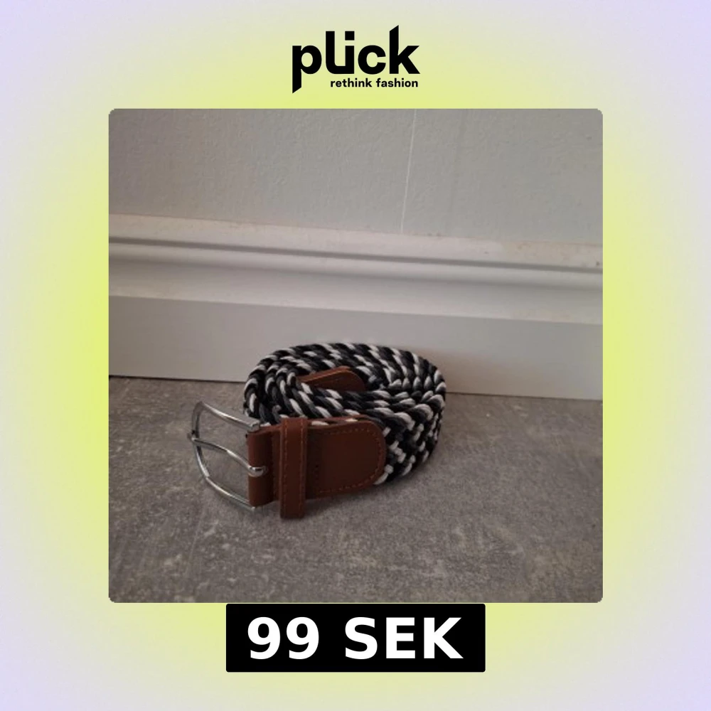 Snyggt flätat bälte i svart och vitt med bruna skinn-detaljer och silvrigt spänne. Bältet har ett randigt mönster och passar perfekt till jeans eller chinos för en stilren look. Flexibelt material som gör det enkelt att justera längden.