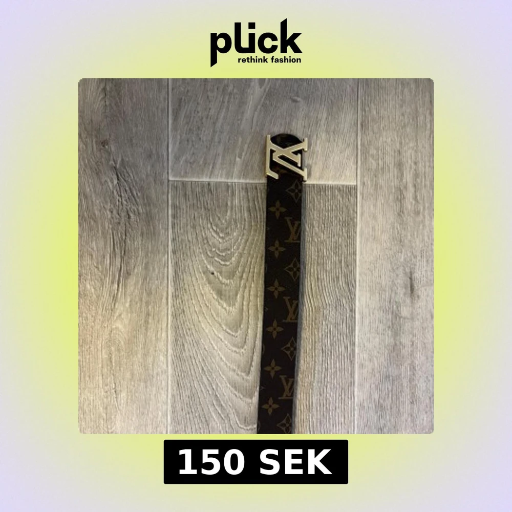 Säljer ett brunt bälte med klassiskt monogrammönster och ett stort Bältet har en stilren design och är tillverkat i skinn med tydliga logodetaljer längs hela remmen.