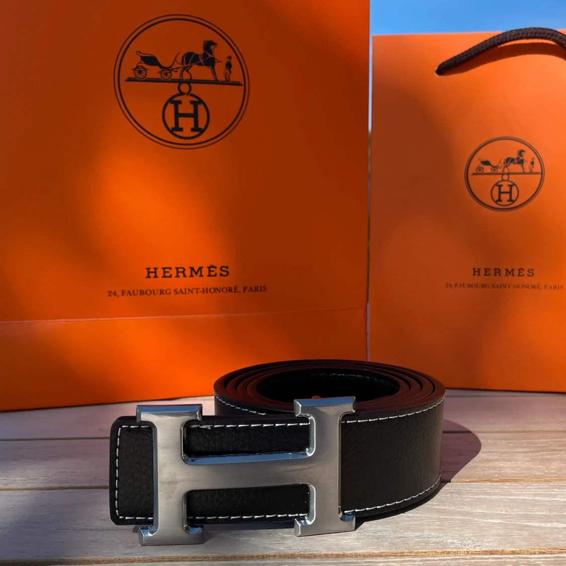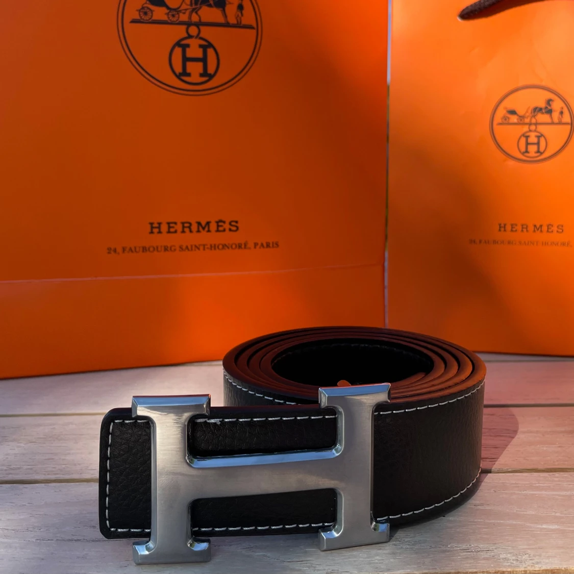 Hermés bälte  - Svart bälte från Hermès i äkta skinn med klassiskt stort H-spänne i silverfärgad metall. Bältet har vit kontrastsöm längs kanterna och en stilren, tidlös design. Perfekt accessoar för att lyfta vilken outfit som helst.