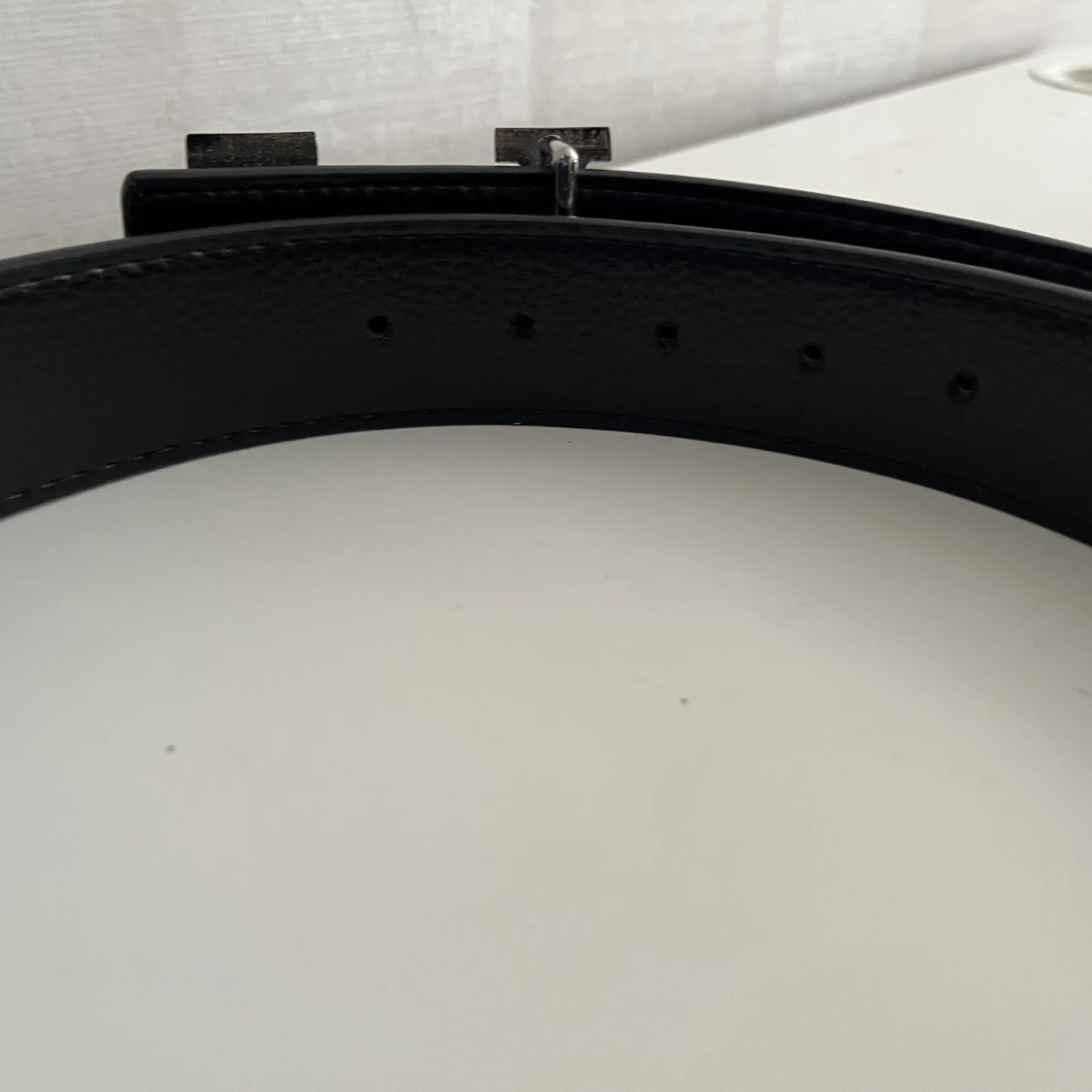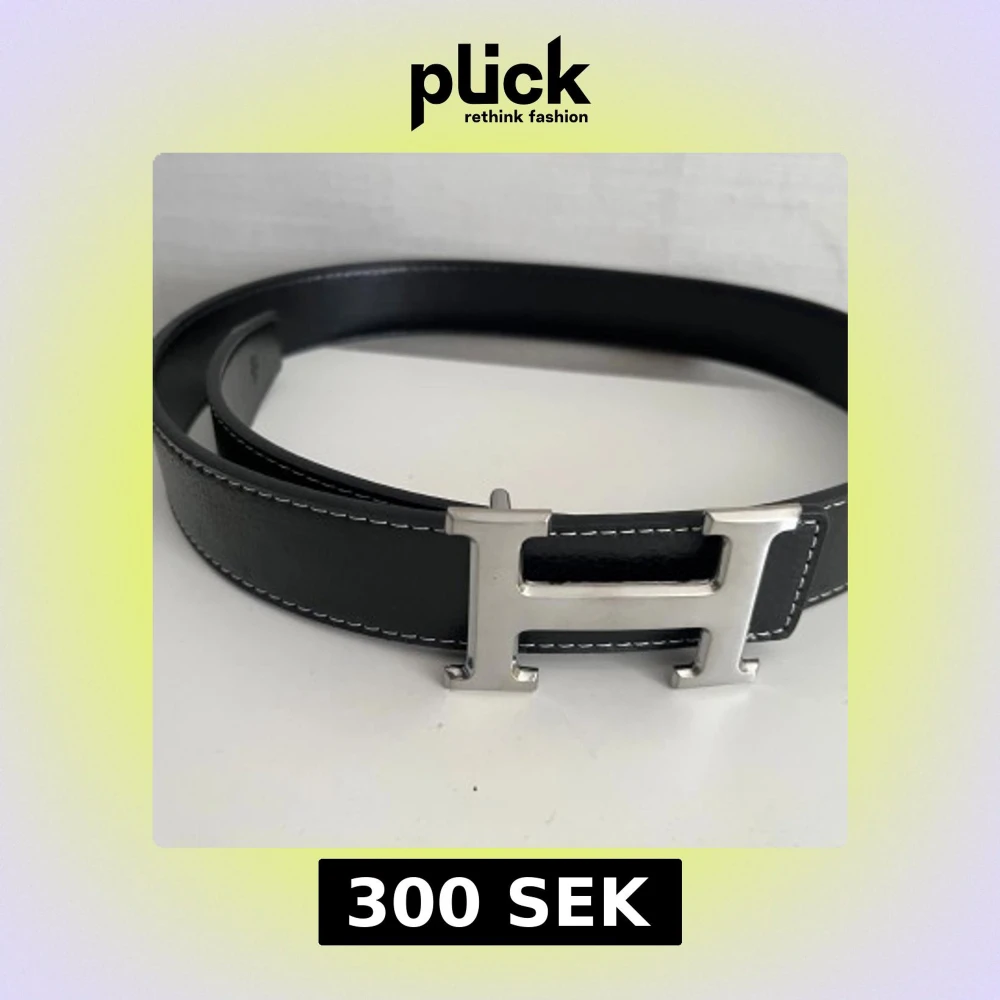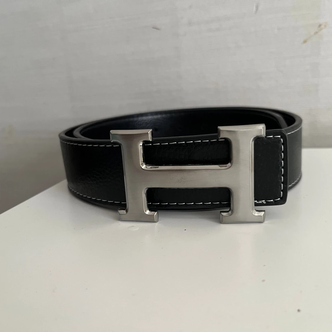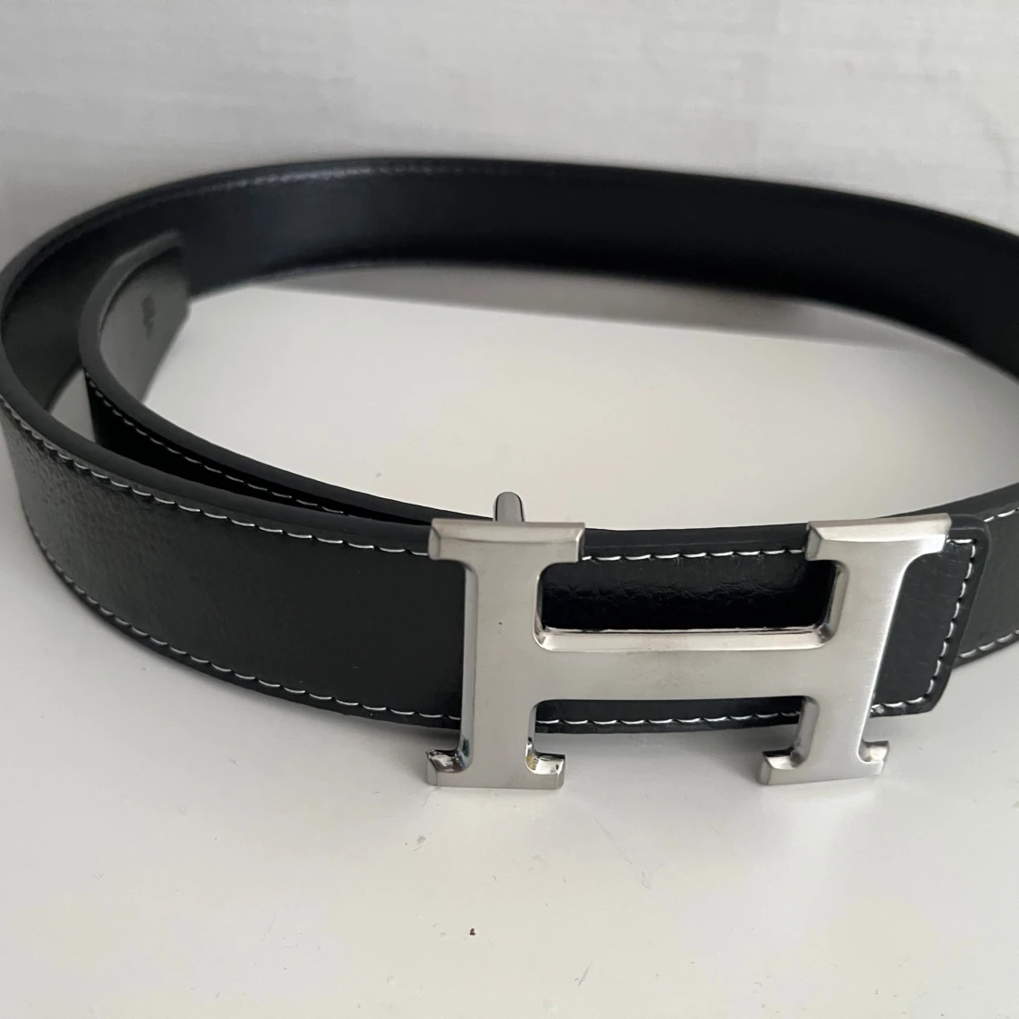 Snyggt svart skärp från med ikoniskt H-spänne i silverfärgad metall. Bältet är gjort i äkta skinn med vita kontrastsömmar längs kanterna. Perfekt accessoar för att lyfta din outfit med en lyxig touch.
