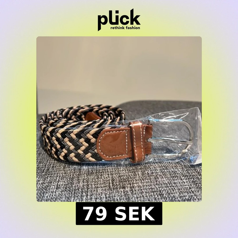 Snyggt flätat bälte i svart, beige och brunt med bruna skinnpartier vid spännet. Spännet är i silverfärgad metall och bältet har en flexibel, vävd design som gör det lätt att justera.