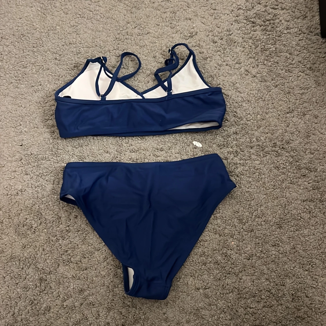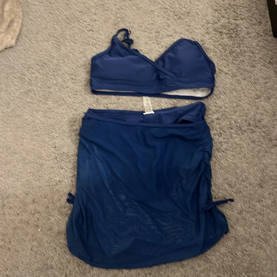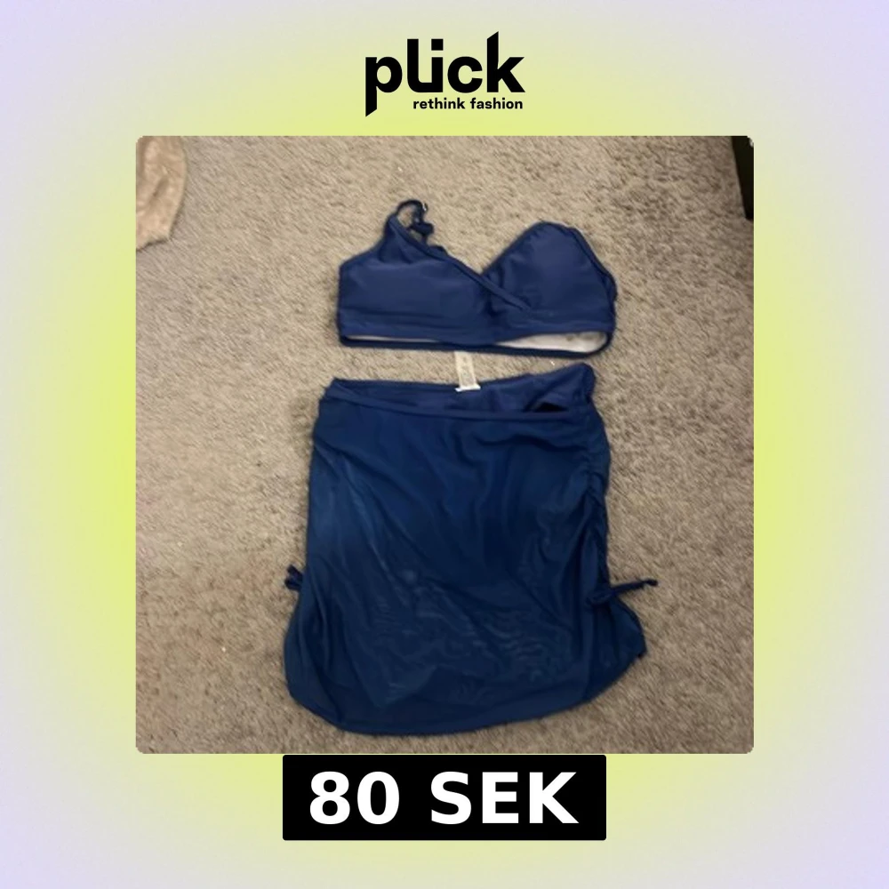 Supersnygg mörkblå bikini med omlott-topp och matchande höga bikinitrosor. Setet kommer med en meshkjol med snörning på sidorna för extra stilpoäng. Bikinin har dubbla axelband och är tillverkad i mjukt syntetmaterial som torkar snabbt. Perfekt för strandhäng och poolparty!