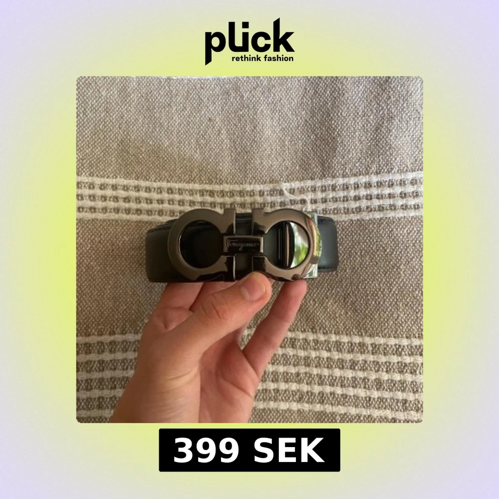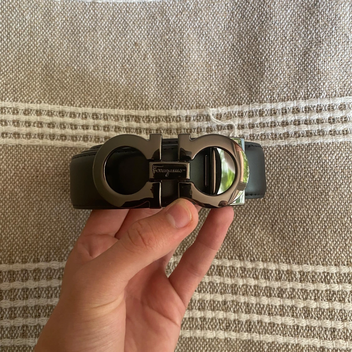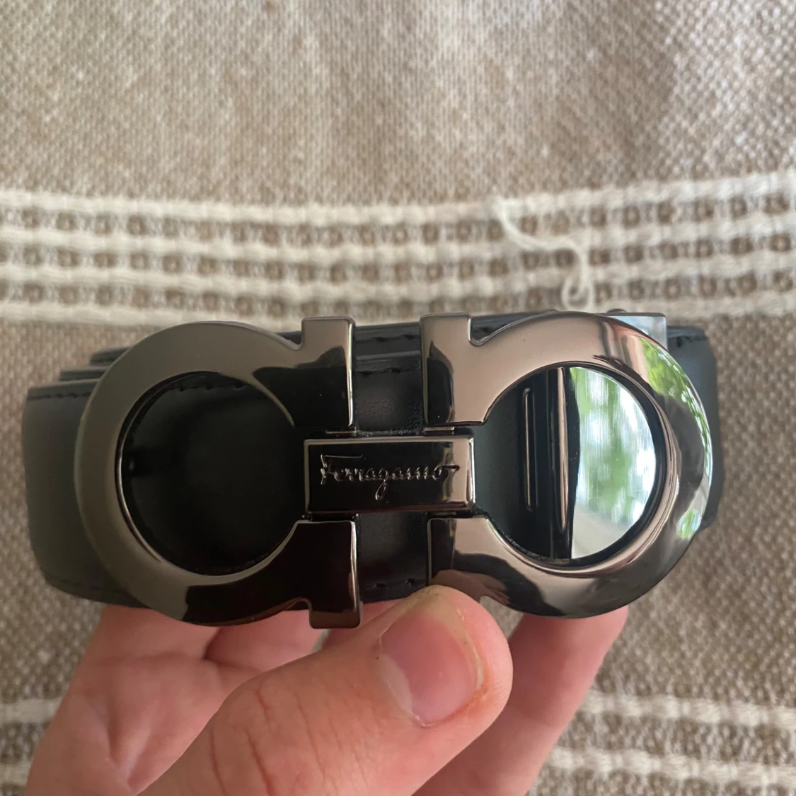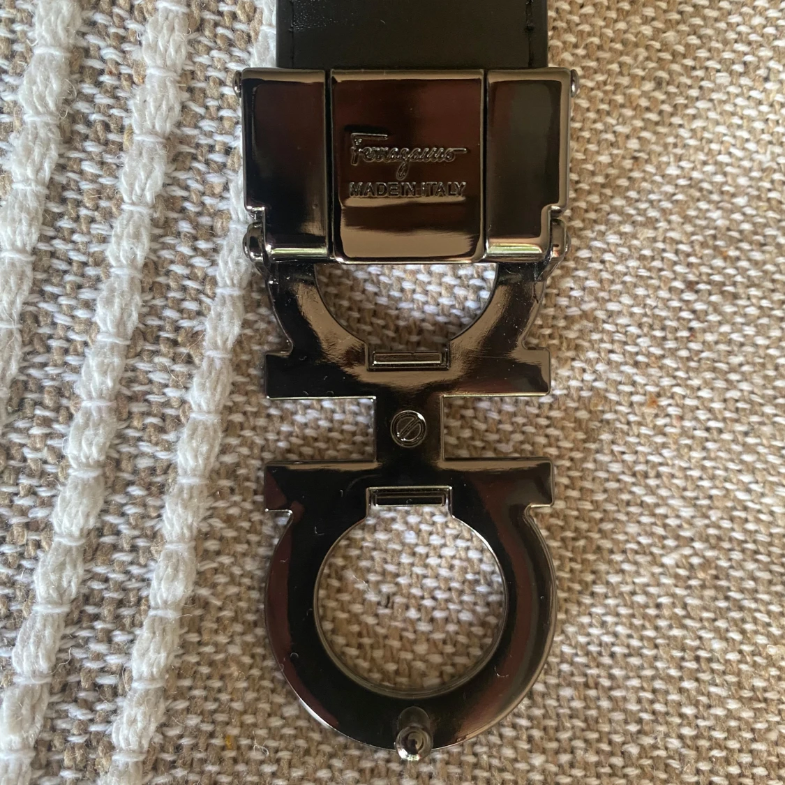 Snyggt svart skärp från Ferragamo i äkta skinn med ikoniskt, blankt metallspänne i silverfärg. Spännet har Ferragamo-loggan ingraverad och en unik, rundad design som sticker ut. Perfekt accessoar för att lyfta din outfit med en lyxig touch.