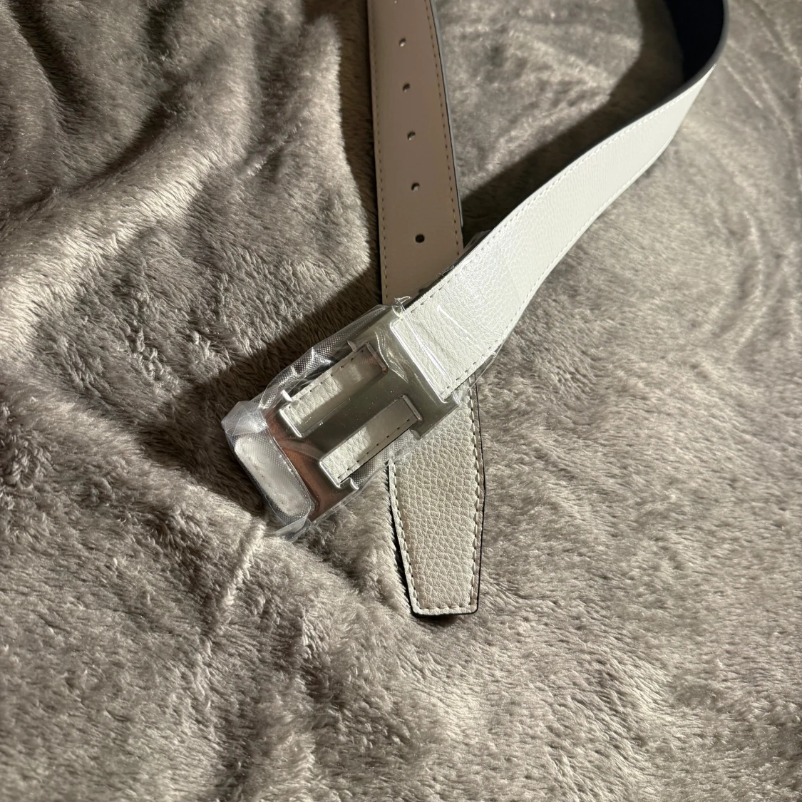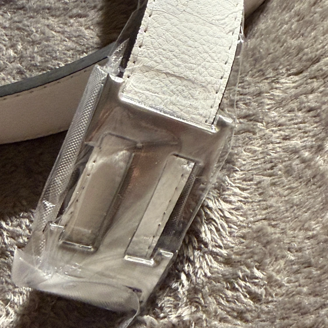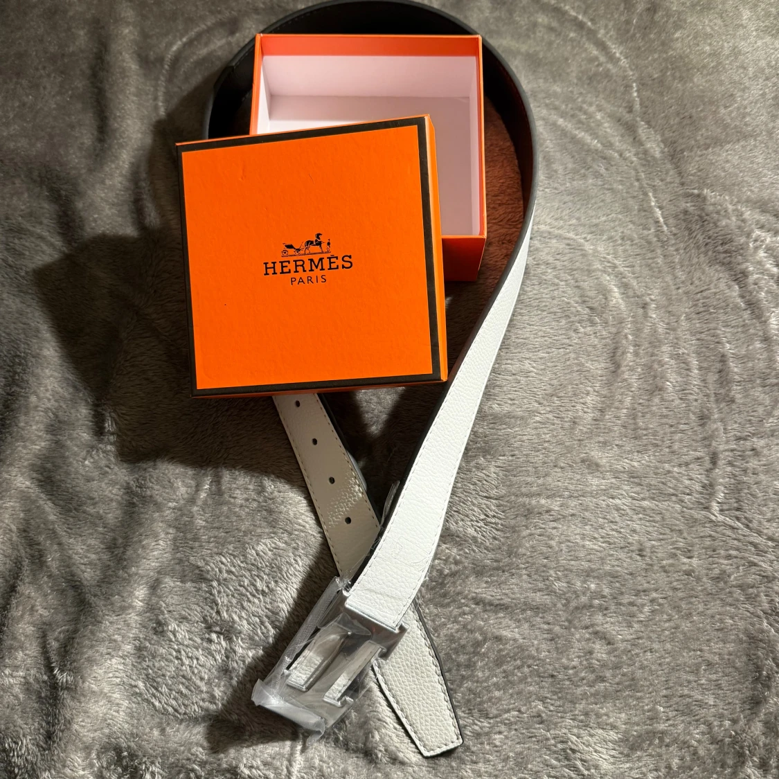 Exklusivt vitt skärp från H i äkta skinn med klassiskt H-formad silverspänne. Bältet har en stilren och lyxig känsla, perfekt för att lyfta vilken outfit som helst. Levereras i original orange H-box. Låda Följer med Samt verktyg för att justera hål. 110Cm