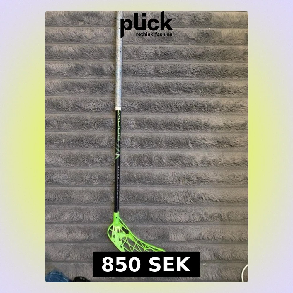 Säljer en innebandyklubba från Unihoc med svart skaft och grön blad. Skaftet har detaljer i grönt och vitt samt ett grepp i ljusgrått med mönster. Bladet är i plast med ett öppet rutmönster för lättare bollkontroll.