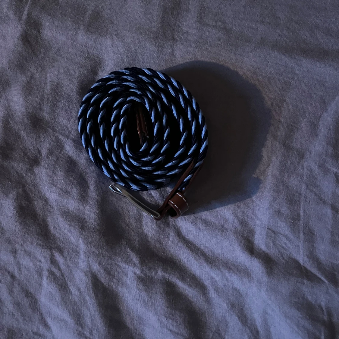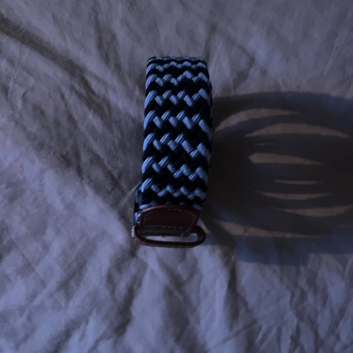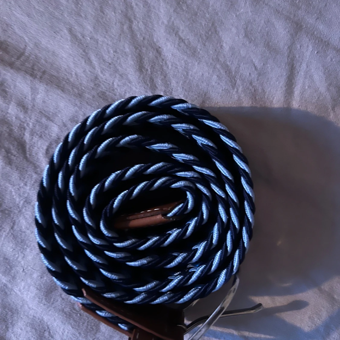 Mörkt blått och ljust blått flätad ”grish belte”. Går ställa in o vilken storlek som helst. På bild 5 så är det när jag har på mig den. Passar perfekt till nästan varje outfit. Jätte skön håller byxorna uppe.