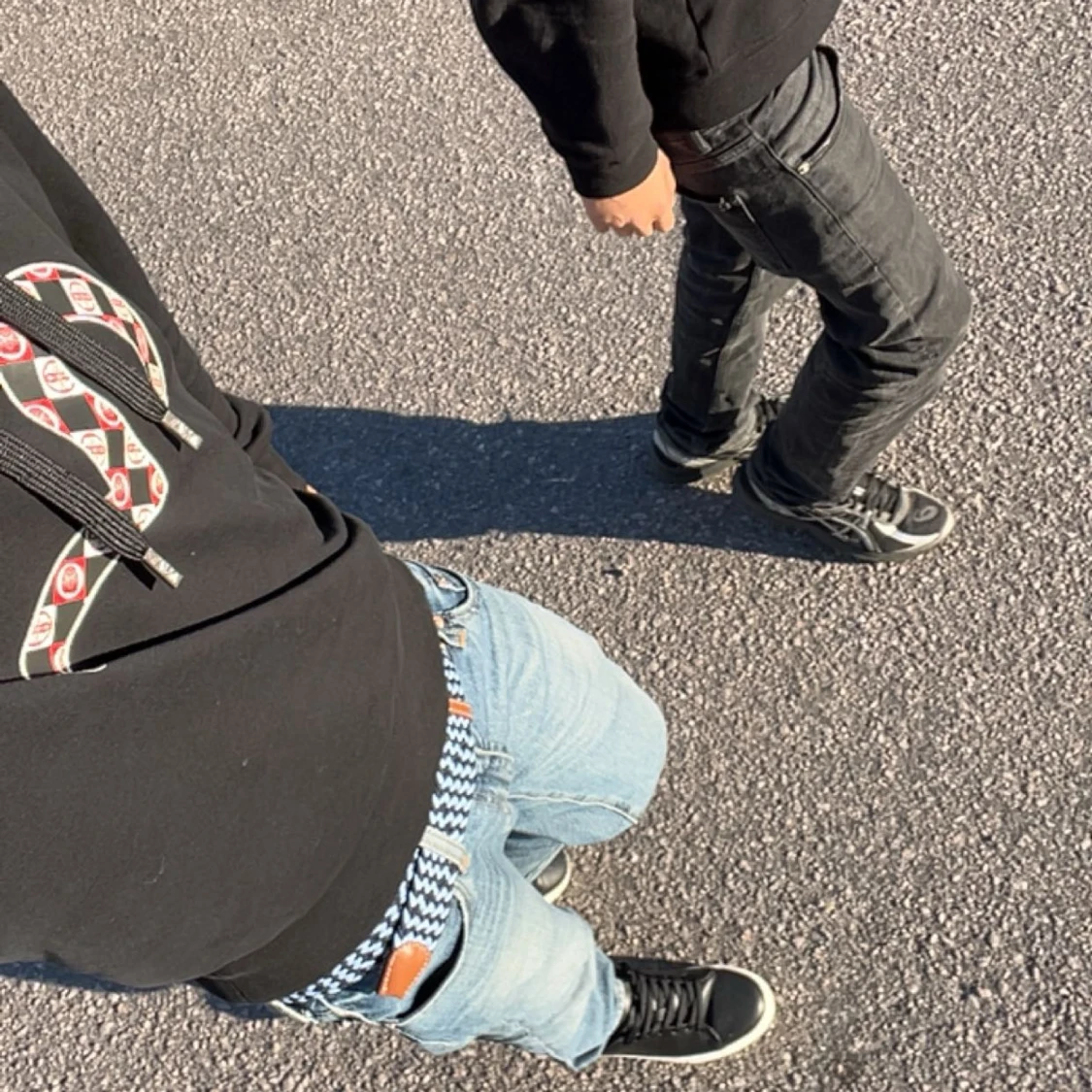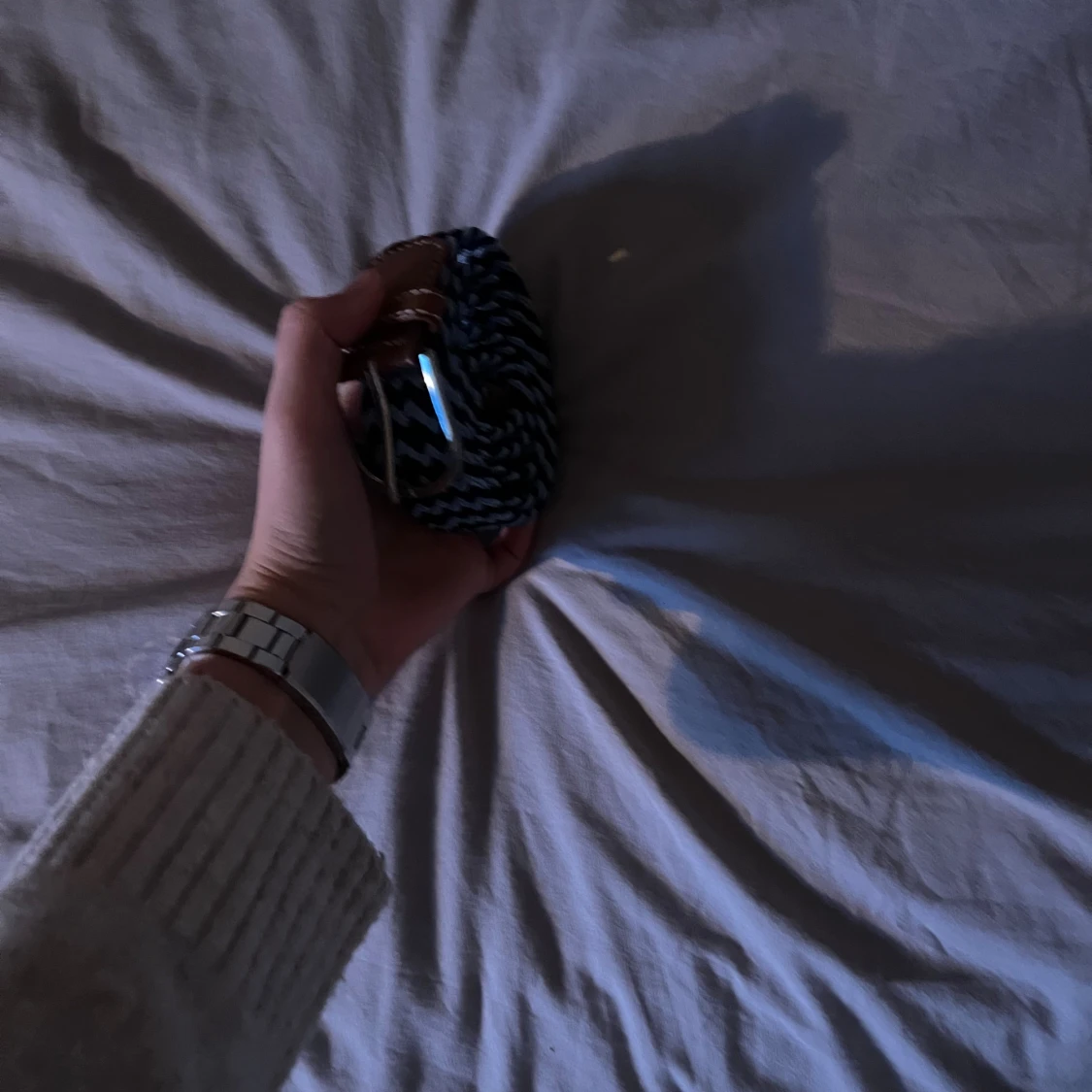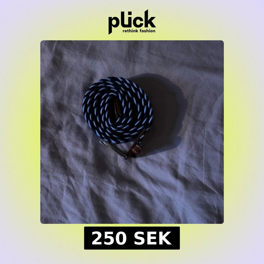 Mörkt blått och ljust blått flätad ”grish belte”. Går ställa in o vilken storlek som helst. På bild 5 så är det när jag har på mig den. Passar perfekt till nästan varje outfit. Jätte skön håller byxorna uppe.