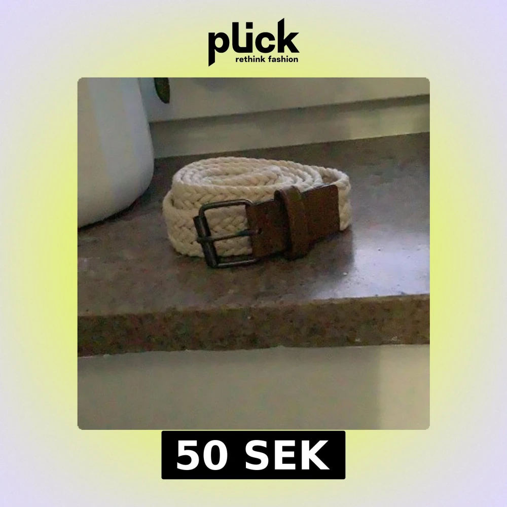 Säljer ett beige flätat bälte med ett klassiskt metallspänne och detaljer i brunt läder. Bältet har en stilren design och passar perfekt till jeans eller chinos. Enkel att justera tack vare det flexibla materialet.