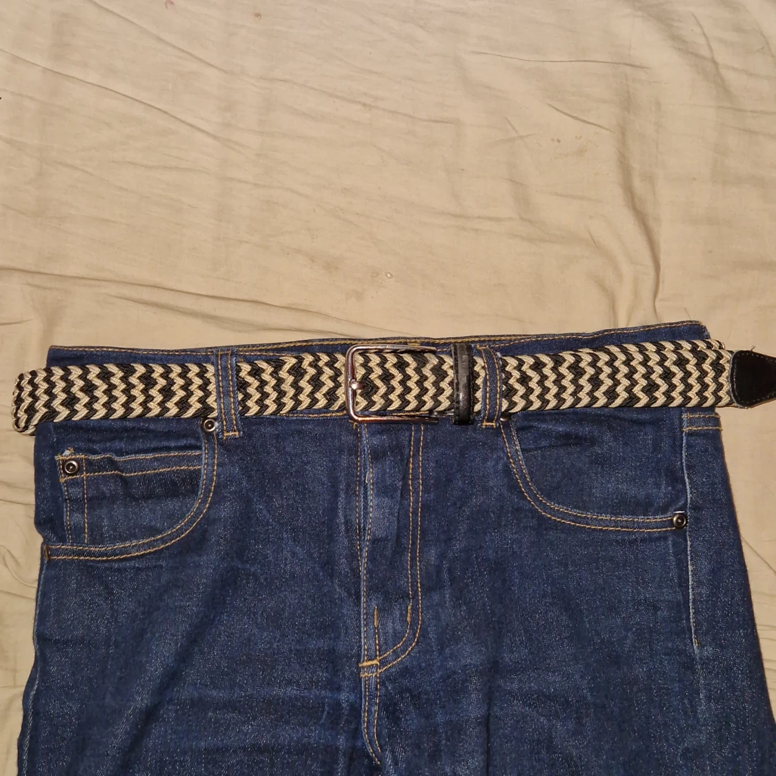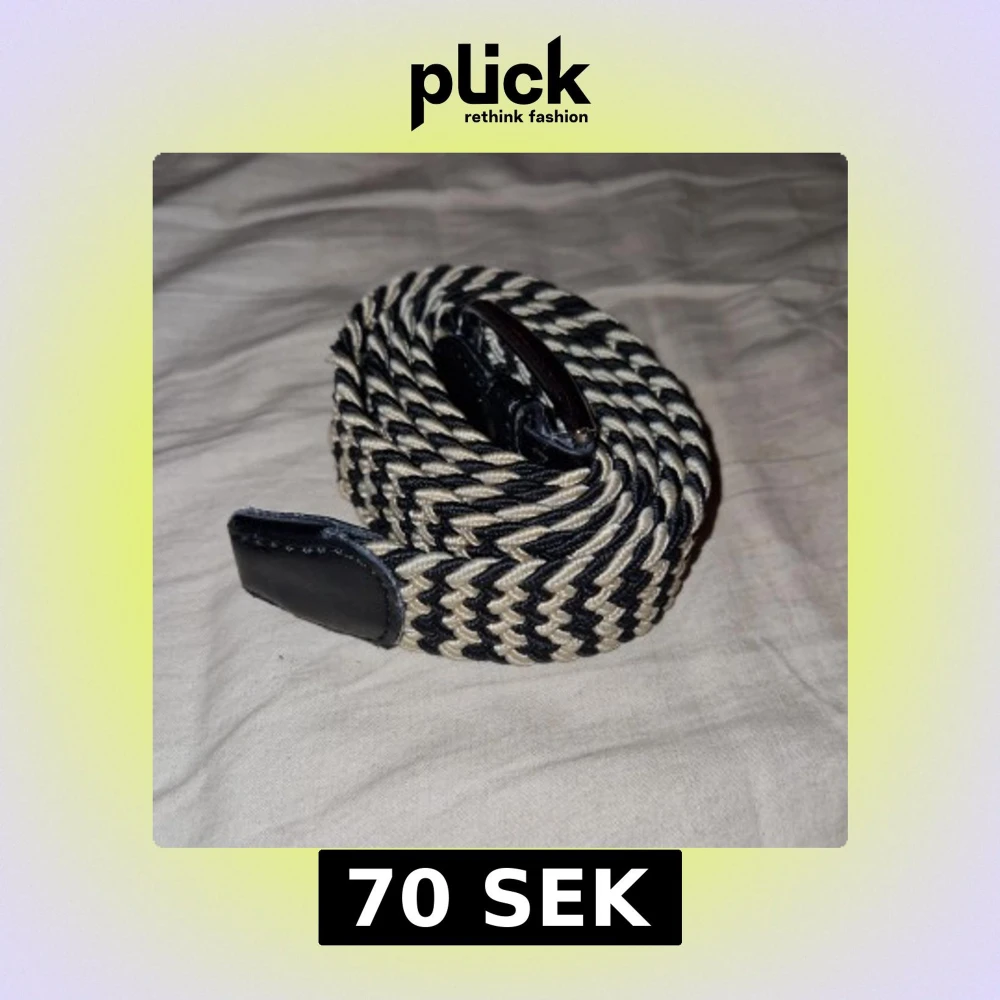 Snyggt flätat bälte i svart och beige med ett zigzag-mönster. Bältet har svarta läderdetaljer vid ändarna och en klassisk spänne. Det är 110cm långt. Perfekt för att ge en stilren touch till din outfit.