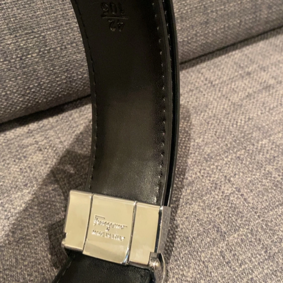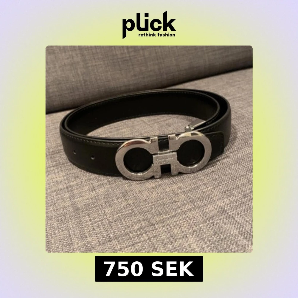 Snyggt svart skinnbälte från Salvatore Ferragamo med en iögonfallande silverfärgad spänne i form av två sammanlänkade cirklar. Perfekt för att ge en stilren touch till din outfit. Bältet har justerbara hål för bästa passform.