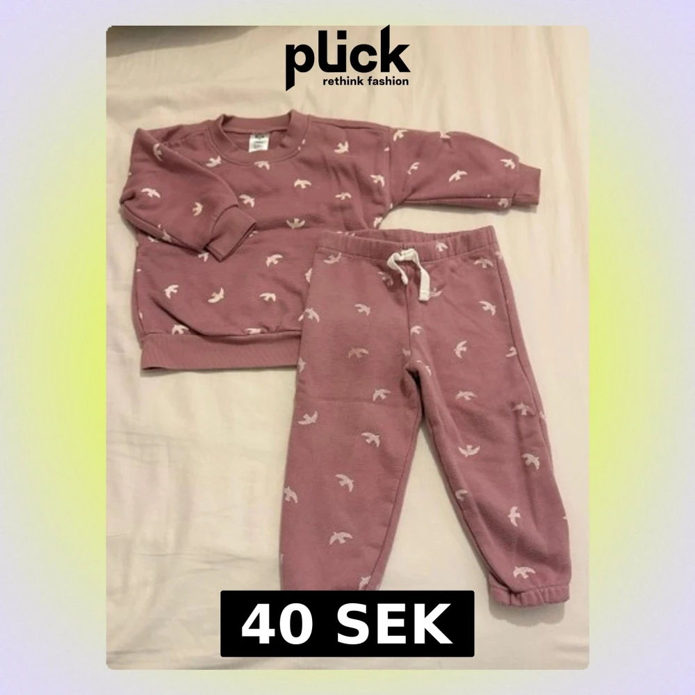 Jätte fin tvådelat barnset med tröja och byxor från Gerber, i dammigt rosa med vitt fågelmönster. Setet är gjort i bomull och polyester och har ribbade muddar samt dragsko i midjan.