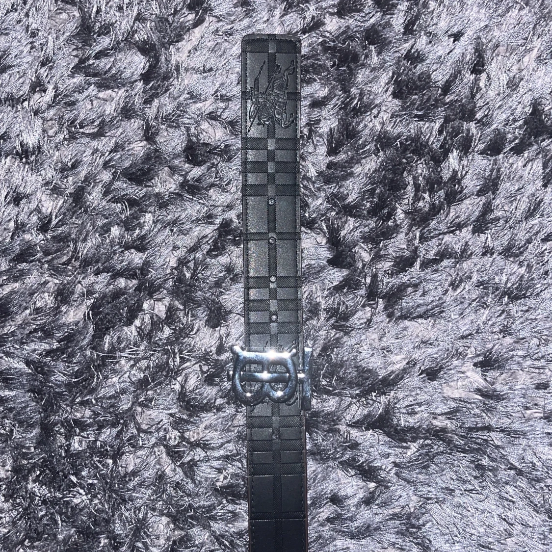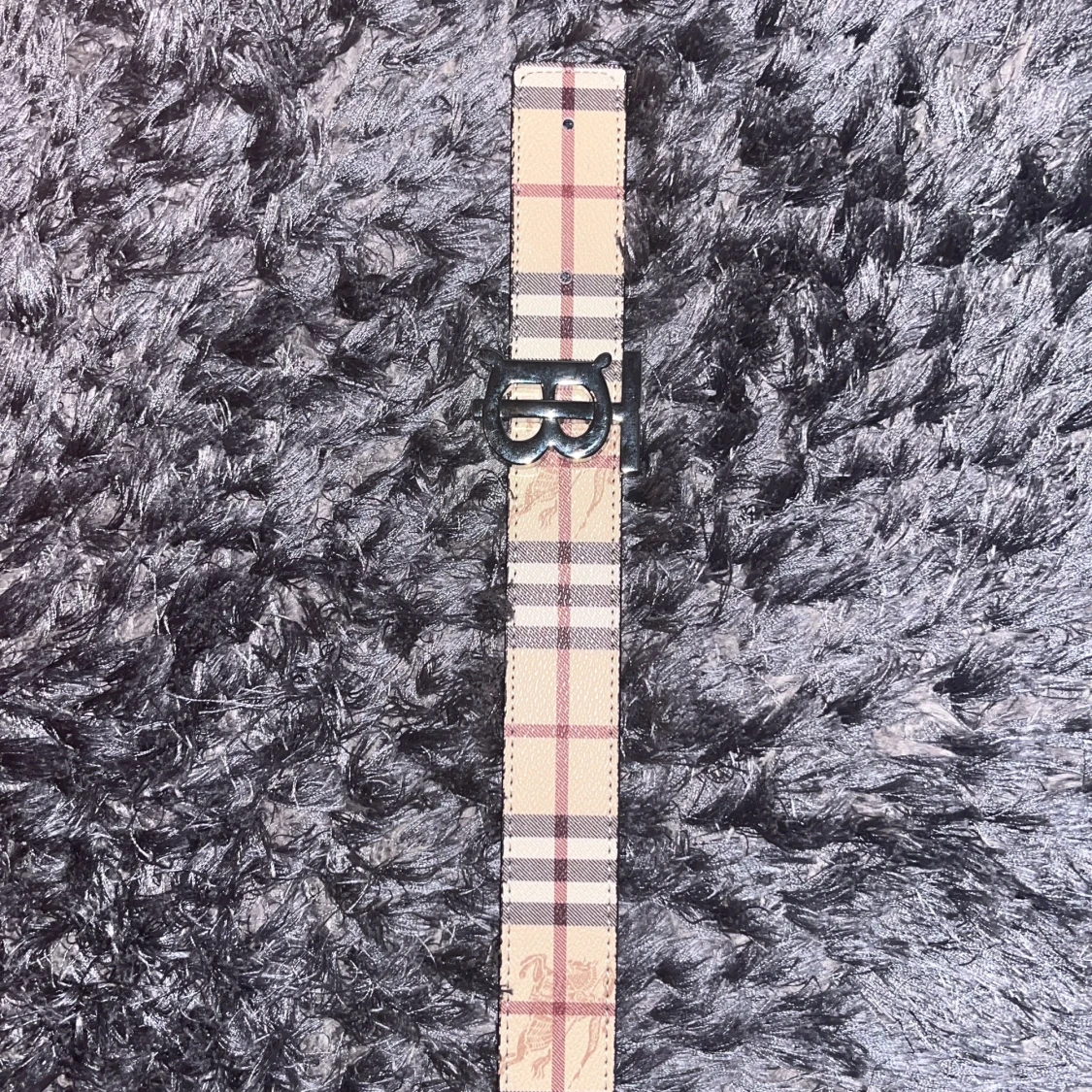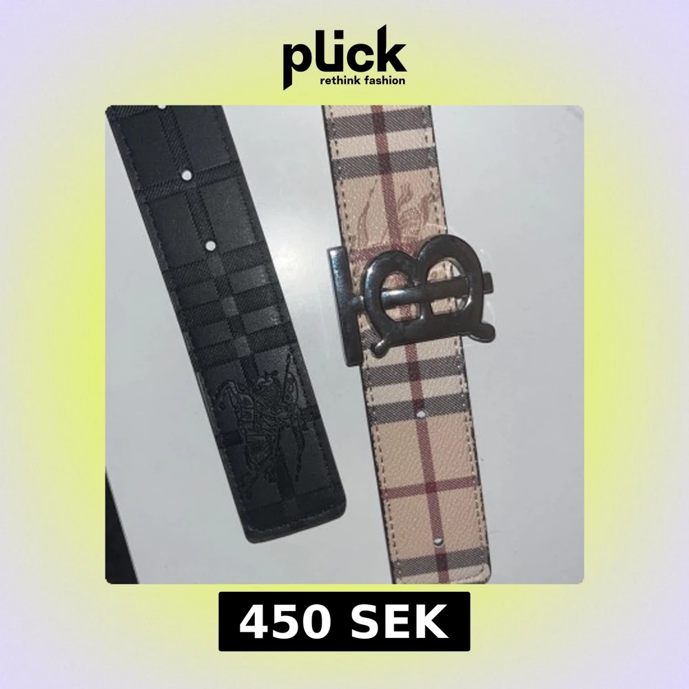 Ett snyggt bälte från Burberry – ett i klassiskt beige rutigt mönster med silverfärgat BB-spänne och ett i svart med diskret rutig struktur och präglad ryttare. Båda är i skinn och har bred design som sticker ut till jeans eller kostymbyxor. Man kan byta sida på bältet och få en svart färg eller beige brun färg.