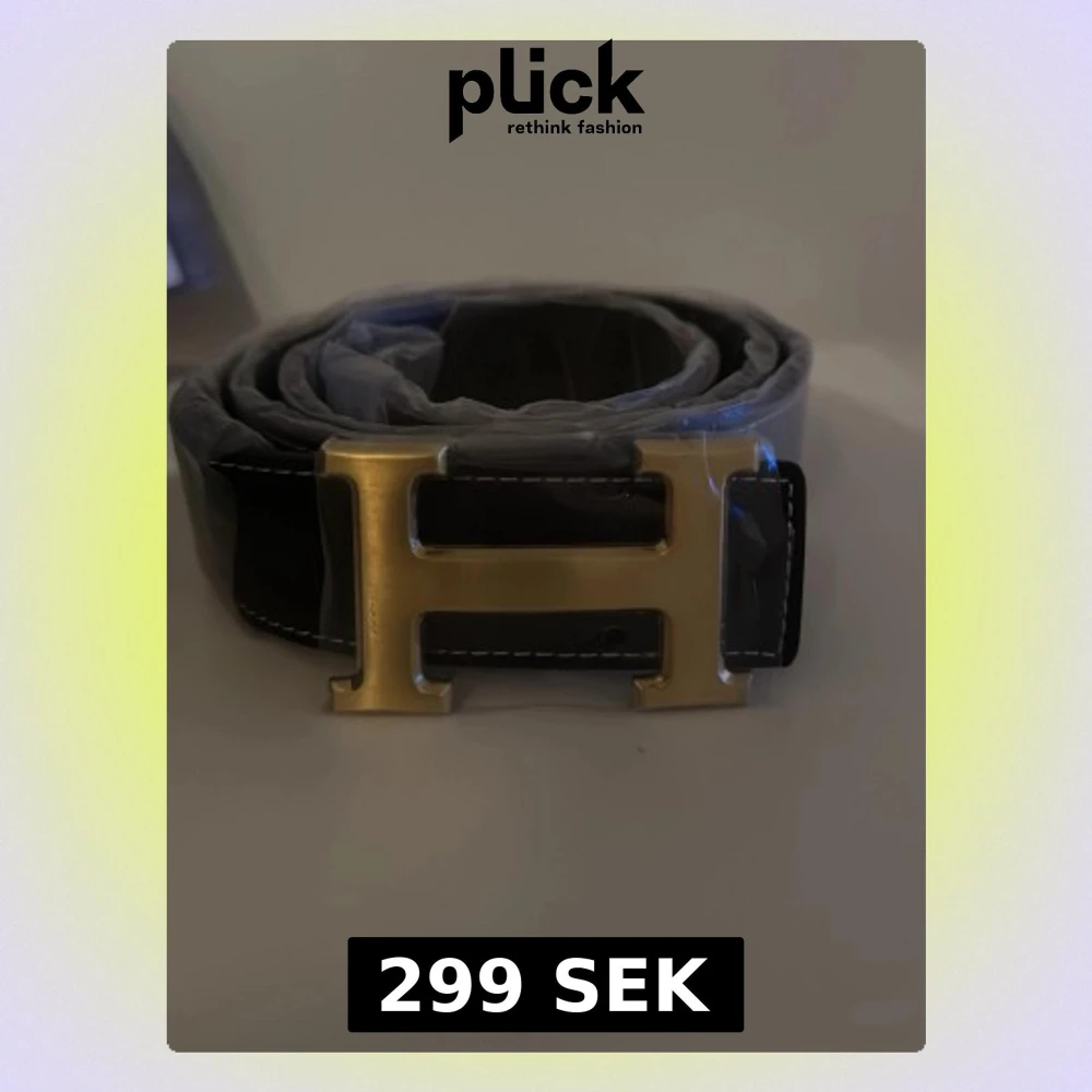Svart läderbälte med ett H på. Det följer med ett armband samt ett verktyg för att göra nya hål med ifall det skulle vara för stort. Säljer då det var för stort för mig samt jag köpte hem lite för många.