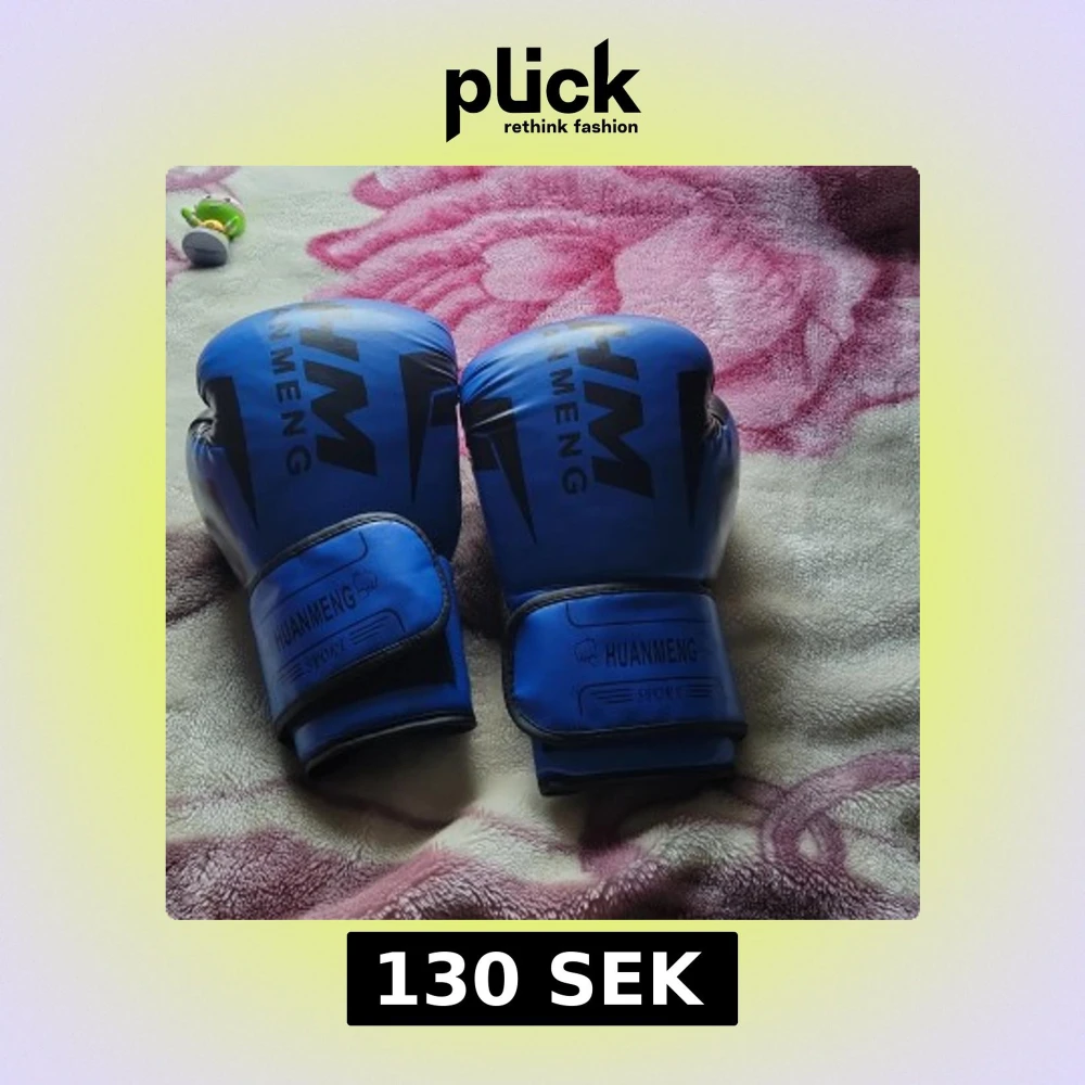 Säljer ett par blå boxningshandskar från HUANMENG med svarta detaljer och tryck. Handskarna har bred kardborre runt handleden för extra stöd och är designade för träning. Snygg sportig look med svart logga och text på ovansidan.