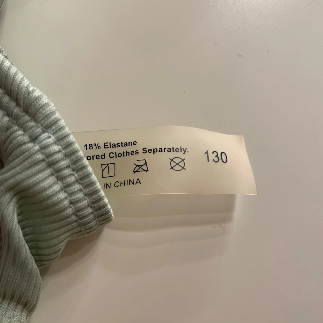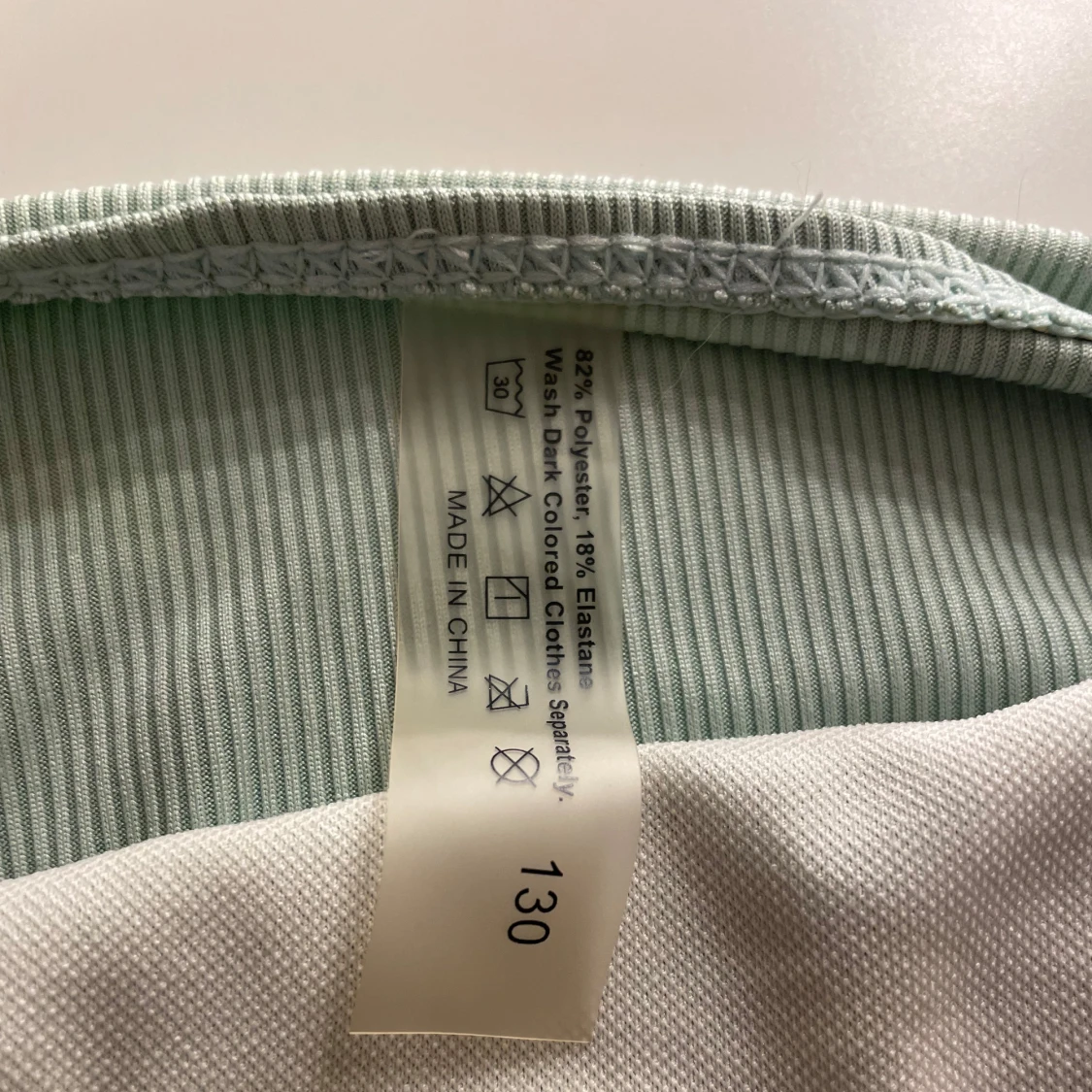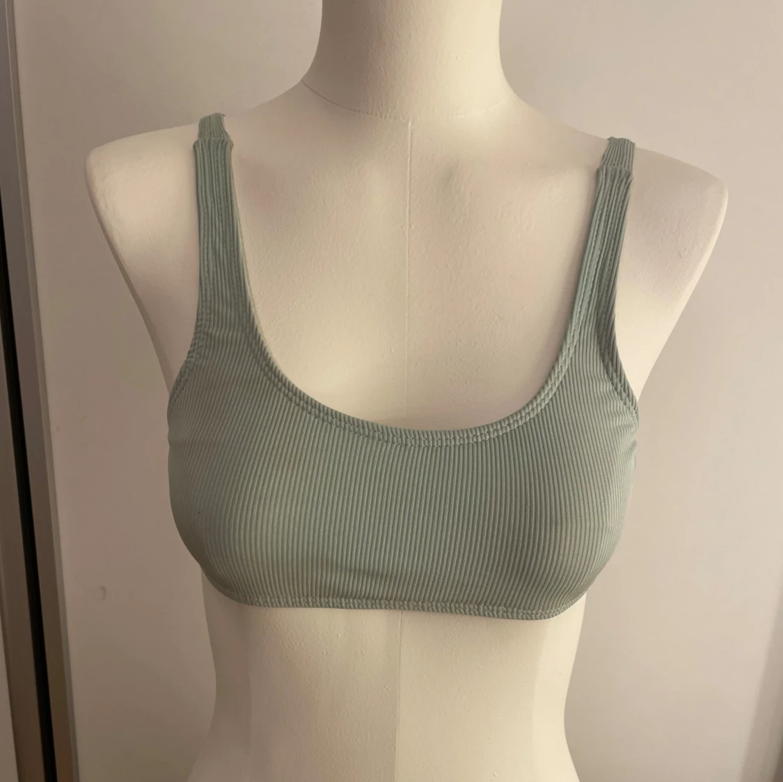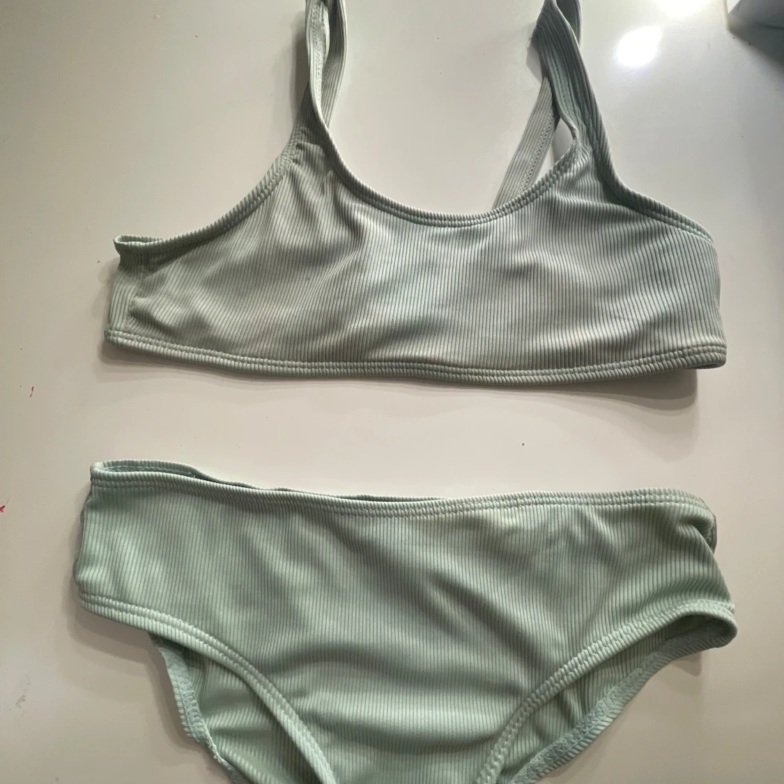 Snygg grön ribbad bikini i en stilren design. Den är från shein och är i storlek 134 men funkar på folk som har 146 och under! Lite missfärgad inuti toppen men annars fläckfri på utsidan.