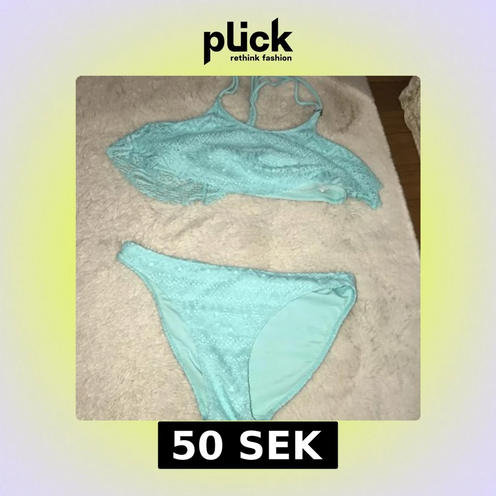 Snygg ljusblå bikini med spetsdetaljer. Toppen har en hög hals och smala axelband, medan trosorna har en klassisk skärning. Perfekt för en dag på stranden eller vid poolen.