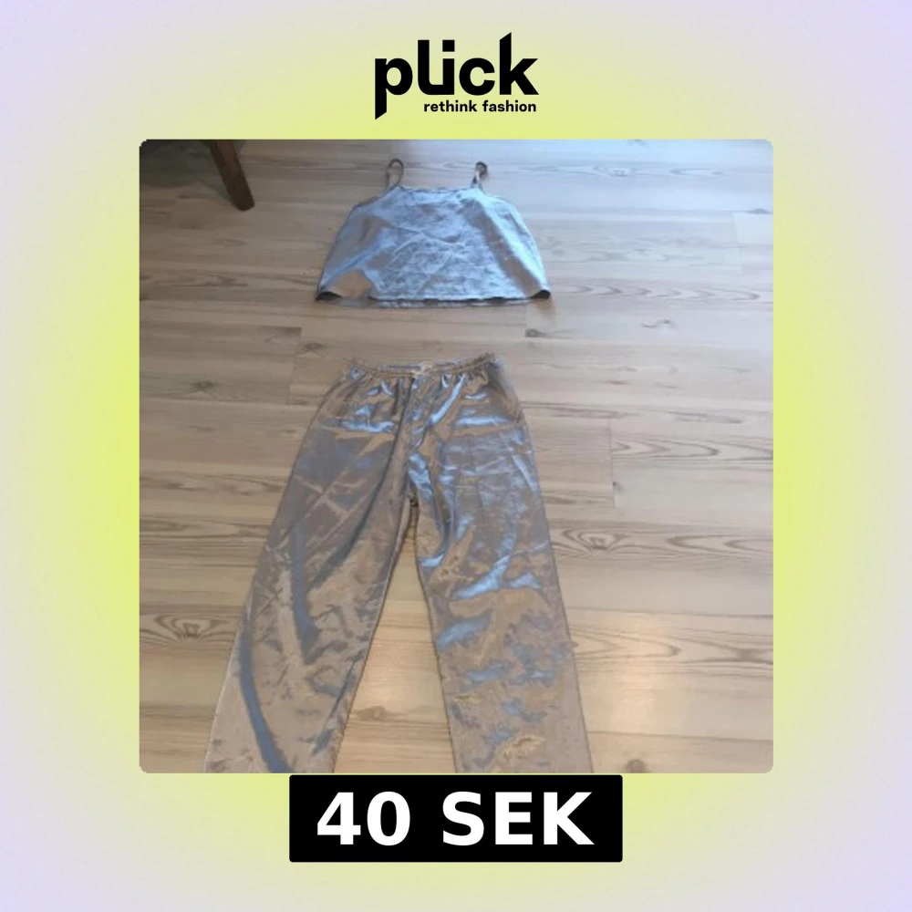Säljer en fin silvrig pyjamas. Inte använd så mycket. Båda delar i storlek 150. Spetsdetaljer längs ner på byxorna och även en liten rosett vid midjan på byxorna.