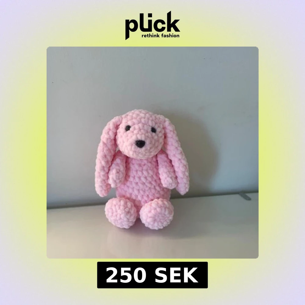 Bilderna visar en rosa, virkad kanin med långa öron och mjuk, fluffig textur. Det är en söt handgjord leksak, perfekt som present eller mysig inredningsdetalj.