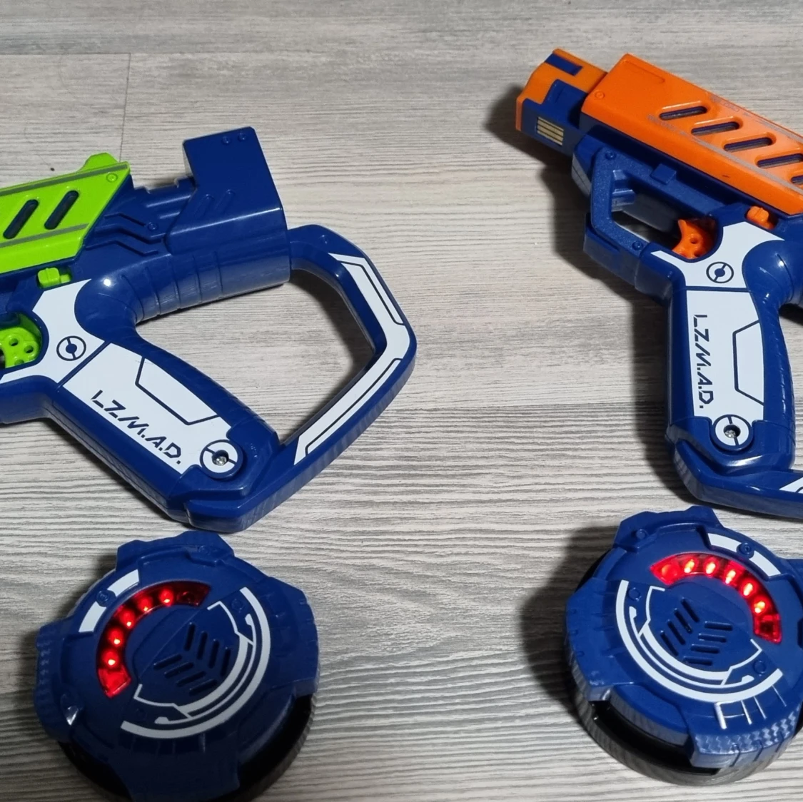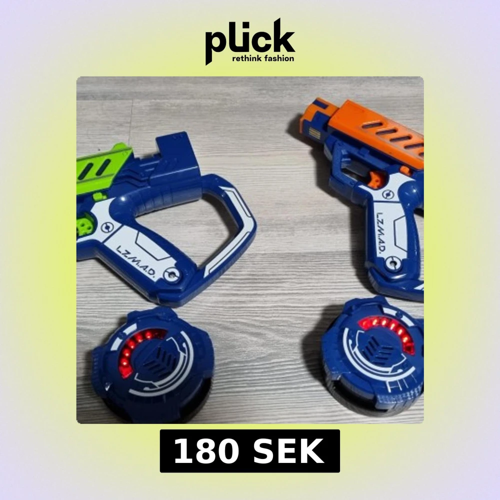 Bilden visar två leksakspistoler och två elektroniska sensorer, troligen för laserspel. Det finns ingen bok synlig på bilden.