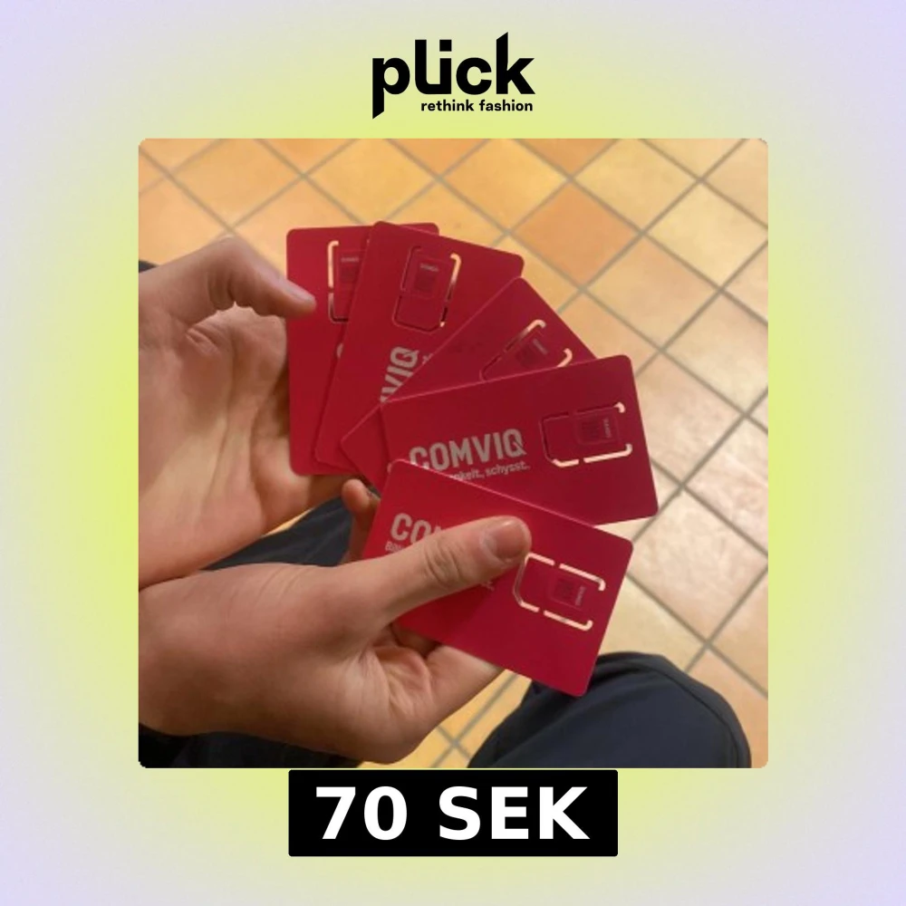 Flera Comviq SIM-kort visas upp. Kortens framsida är röd med vit text och baksidan är vit med information och en chipmodul. Perfekt för den som behöver extra SIM-kort för mobiltelefoner.