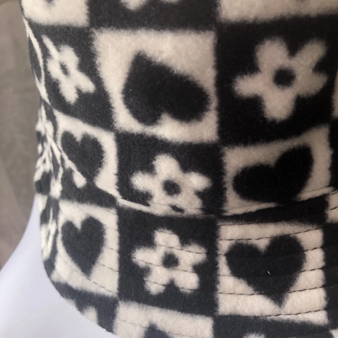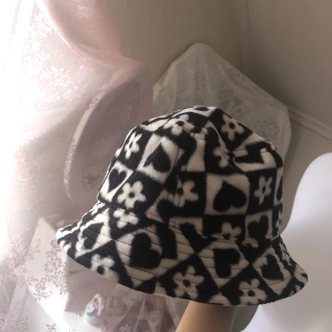 Fluffig buckethat i ”rutigt schack mönster” i svart och vitt med hjärtan och blommor på! Från H&M divided i nyskick prislapp sitter kvar men köpt för nåt år sen så finns inte kvar på H&M. Super mysig å ha:) Läs gärna bio<3