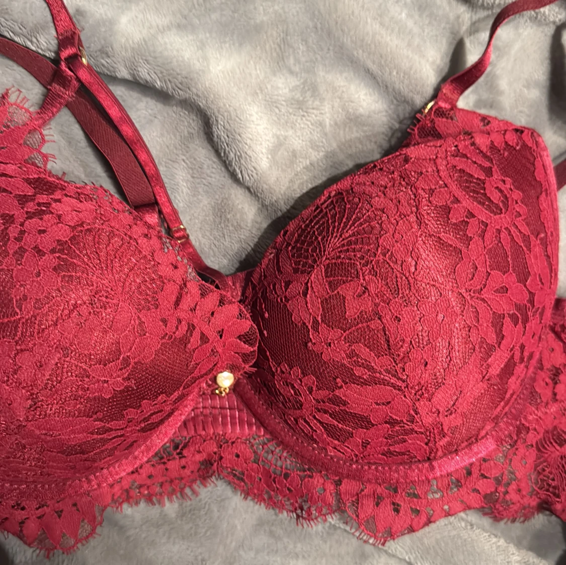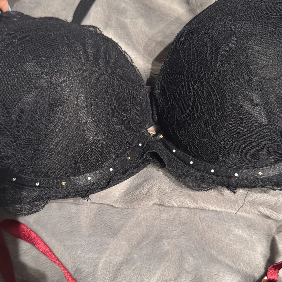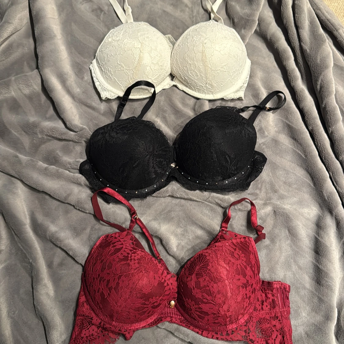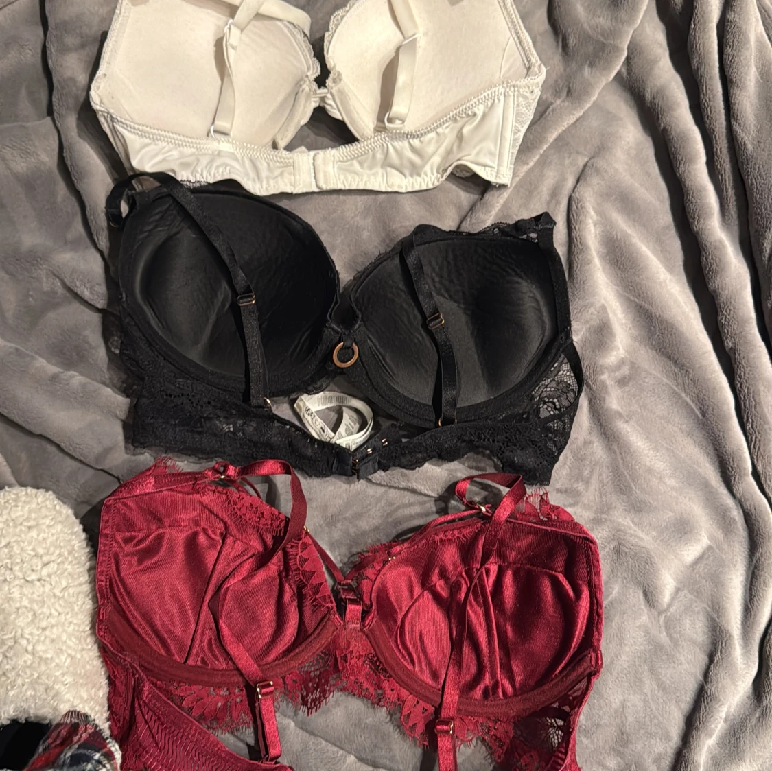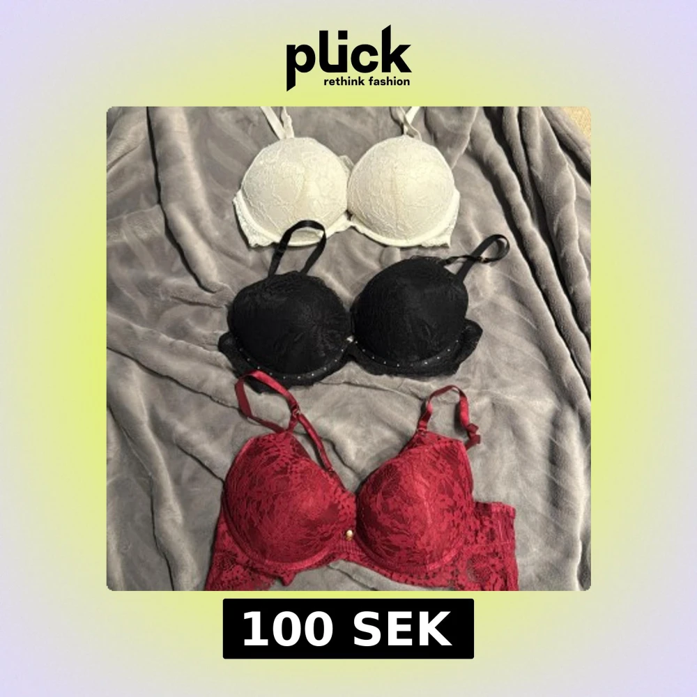 Säljer tre bh-toppar med spetsdetaljer i färgerna vit, svart och vinröd. Alla har vadderade push up kupor och justerbara axelband. Den svarta har små pärldetaljer längs kanten, som lossnar lätt, och den vinröda har en liten pärla framtill samt band som går över kupan på brösten. OBS den vita är i 70C, de andra 75C. OBS ENDAST DEN SVARTA KVAR❤️