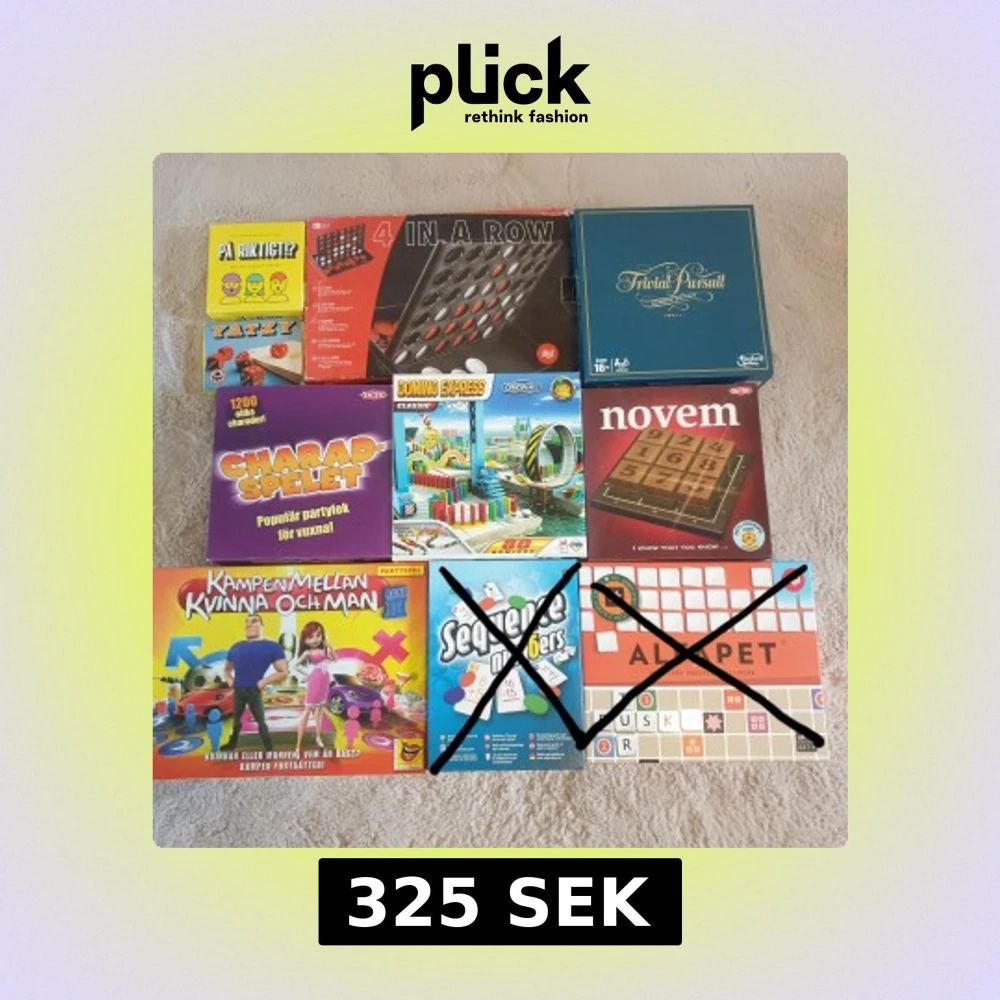 Sällskapsspel för hela familjen. Säljes som paket eller styckvis. Pris styckvis: Trivial Pursuit 95 kr Alfapet 75 kr SÅLT Charadspelet 45 kr 4 i rad 25 kr Yatzy 10 kr På Riktigt? 50 kr Novem 50 kr Domino Express 25 kr Kampen mellan man och kvinna 75 kr Sequence num6ers 40 kr SÅLT Pris för hela paketet: 325 kr
