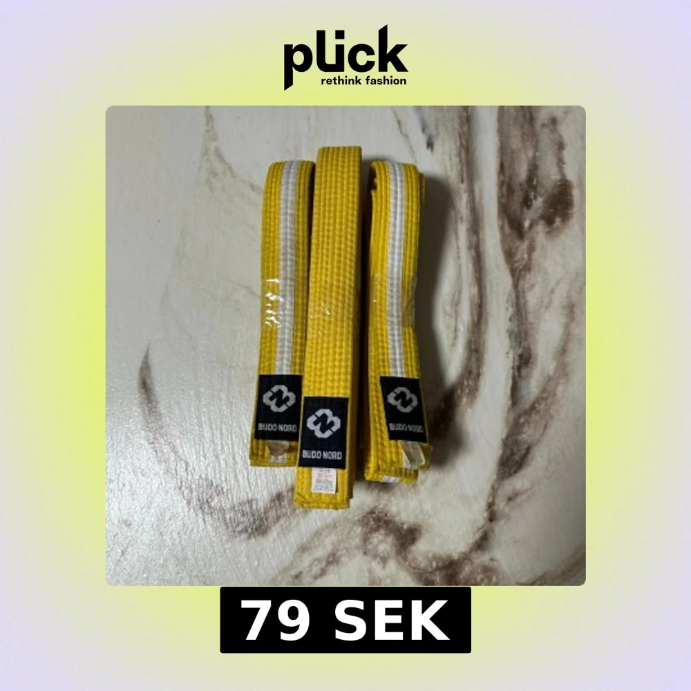 Säljer ett gult bälte med vita ränder från Budo-Nord, perfekt för kampsport. Bältet är tillverkat i 55% bomull och 45% polyester och har tydliga svarta logolappar. Finns i längderna 320 cm och 240 cm.