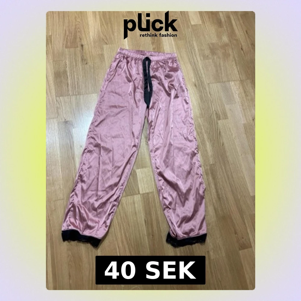Snygga rosa satinpajamasbyxor med svart knytband i midjan och svarta spetsdetaljer vid bensluten. Perfekta för mysiga hemmakvällar. Byxorna har en avslappnad passform och resår i midjan för extra komfort.