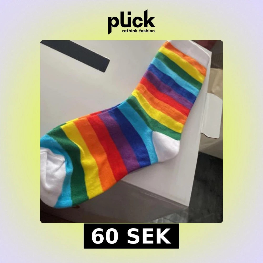 Färgglada strumpor med regnbågsränder i rött, orange, gult, grönt, blått och lila. De har vita tår och muddar, vilket ger en fräsch kontrast. Perfekta för att lysa upp vilken outfit som helst!