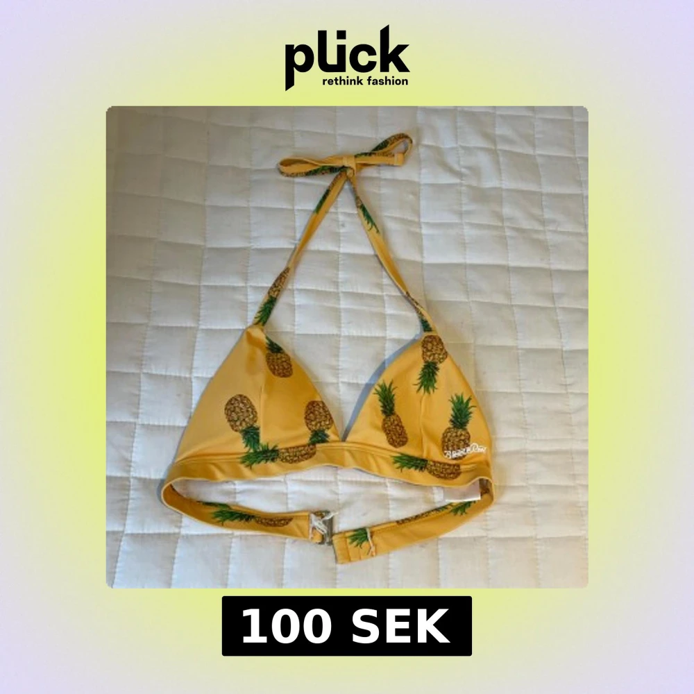 Snygg gul bikiniöverdel från Blancheporte med ananasmönster. Triangelformade kupor och knyt i nacken ger en snygg och cool strandlook. Perfekt för sommarens alla bad och poolhäng.