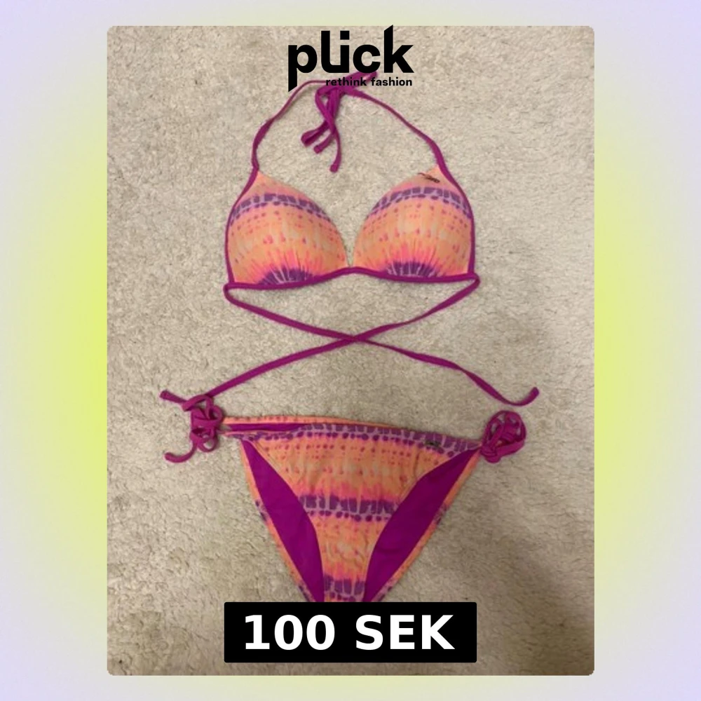 Säljer en snygg bikini med tie-dye mönster i orange, rosa och lila. Överdelen har push-up och knytband som kan korsas runt midjan. Underdelen har lila sidoband och matchande färgblock. Perfekt för stranden eller poolen! Köpt i Spanien