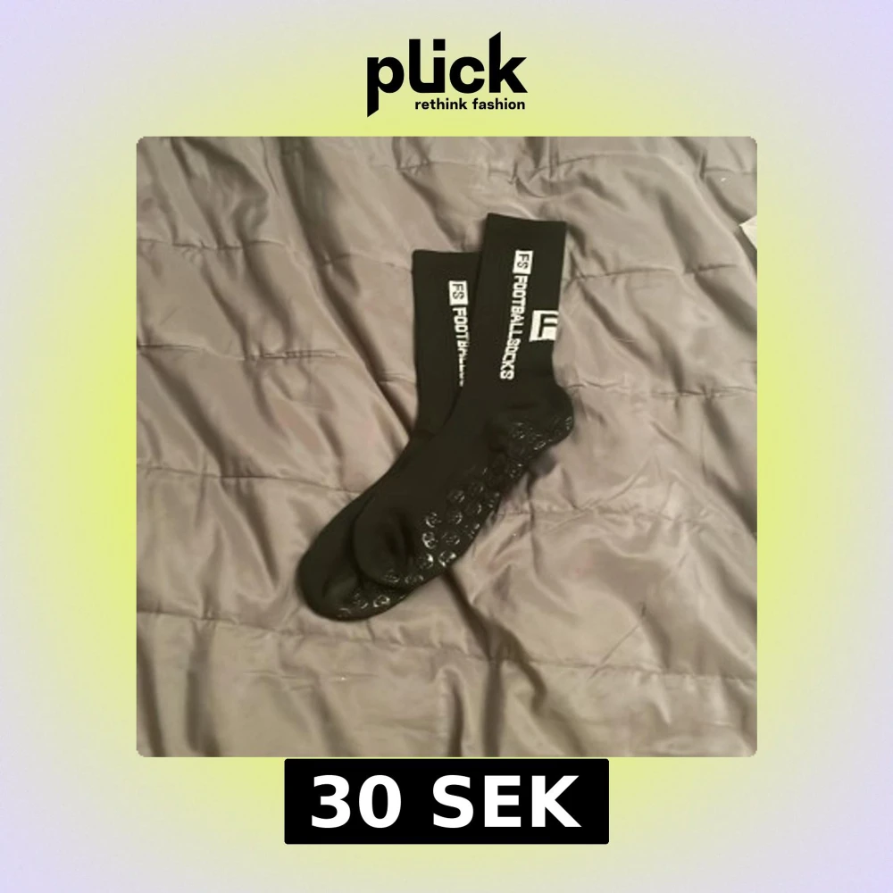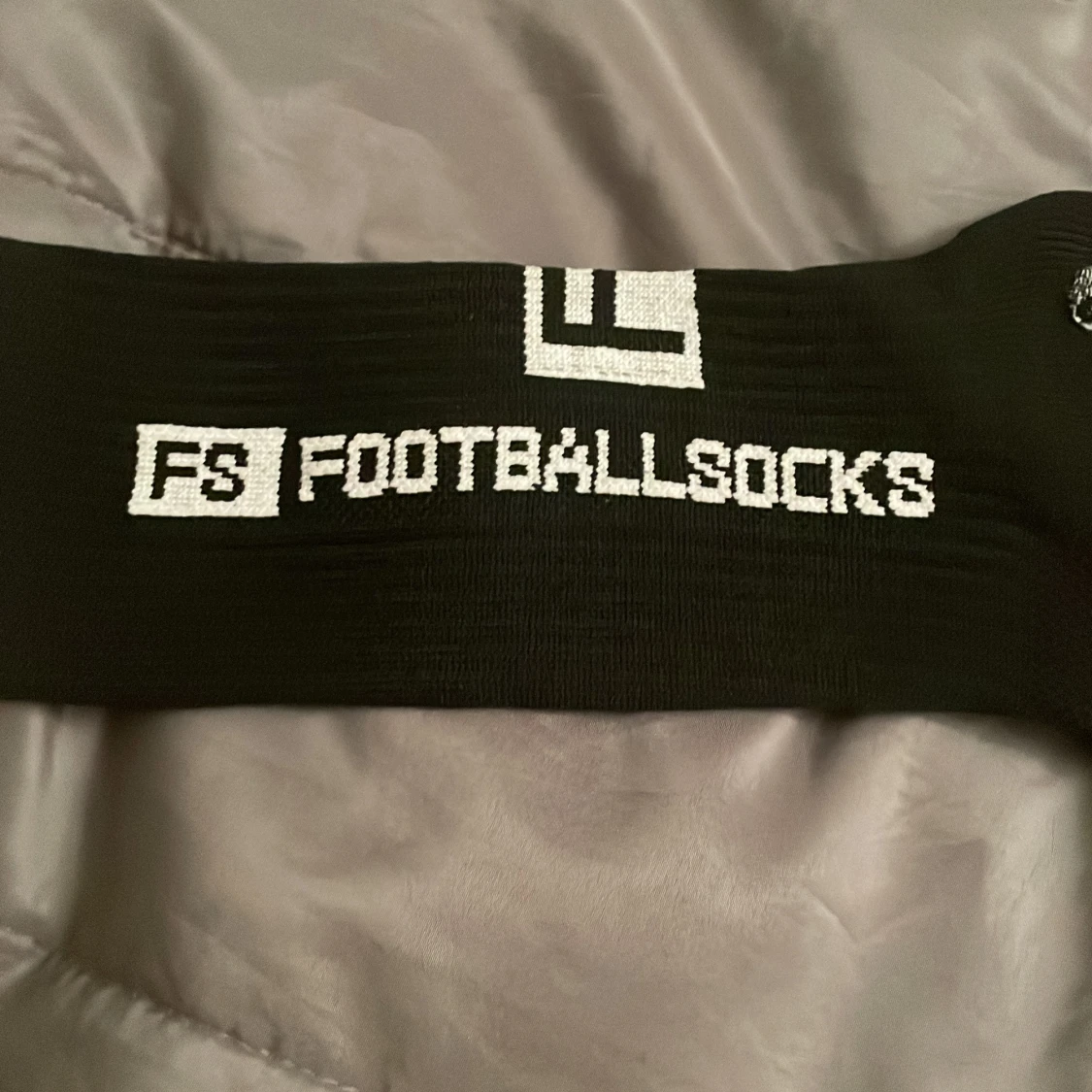 Svarta sportstrumpor från FS Football Socks med vit logga och text längs skaftet. Undersidan har gummigrepp för extra fäste, perfekt för fotboll eller annan träning. Snygg och funktionell design som sitter bra på foten.