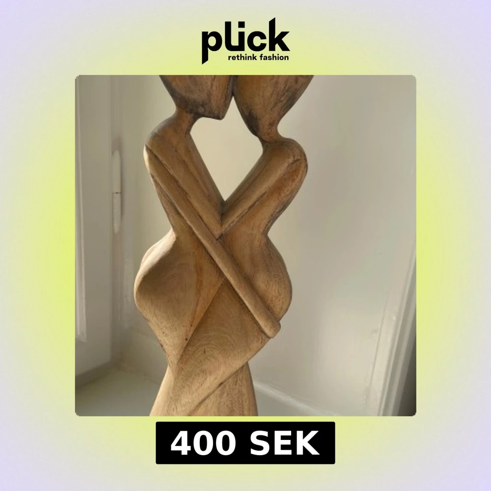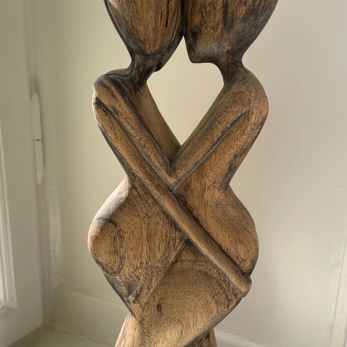 Unik handgjord träskulptur som föreställer två personer i en kärleksfull omfamning. Skulpturen har mjuka, organiska former och är tillverkad i ljust trä med naturlig ådring. Perfekt som dekorativ inredningsdetalj.