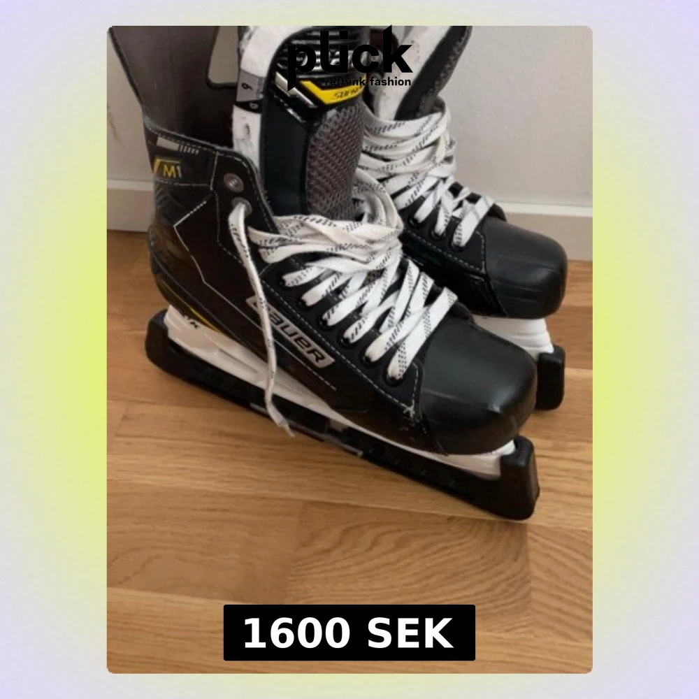 Säljer ett par svarta och vita Bauer Supreme M1 hockeyskridskor med gula detaljer. Skridskorna har klassisk snörning, robust plastkappa och vit skena. Perfekta för dig som vill ha bra stöd och kontroll på isen. Använda en träning så de är helt nya