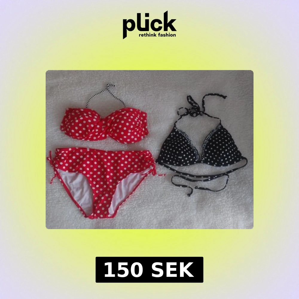 Två fina bikinisar med prickigt mönster. Den ena är röd med vita prickar. Storlek 44 och den andra är svart med vita prickar storlek 44/46 ( bara överdel på den svarta) Nya. Från rök och djurfritt hem.