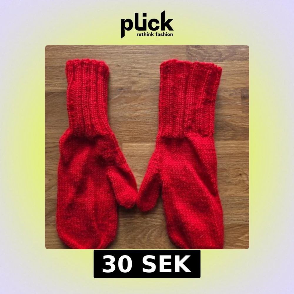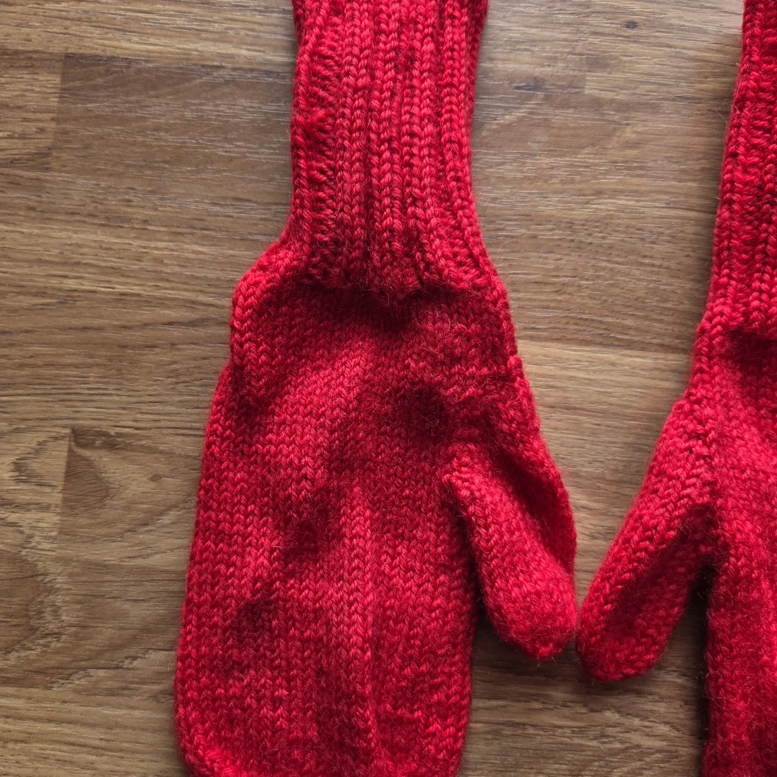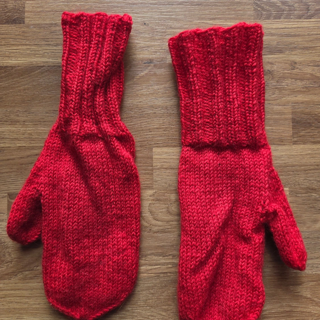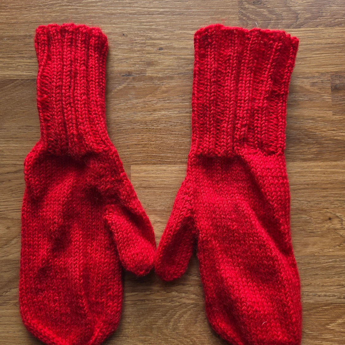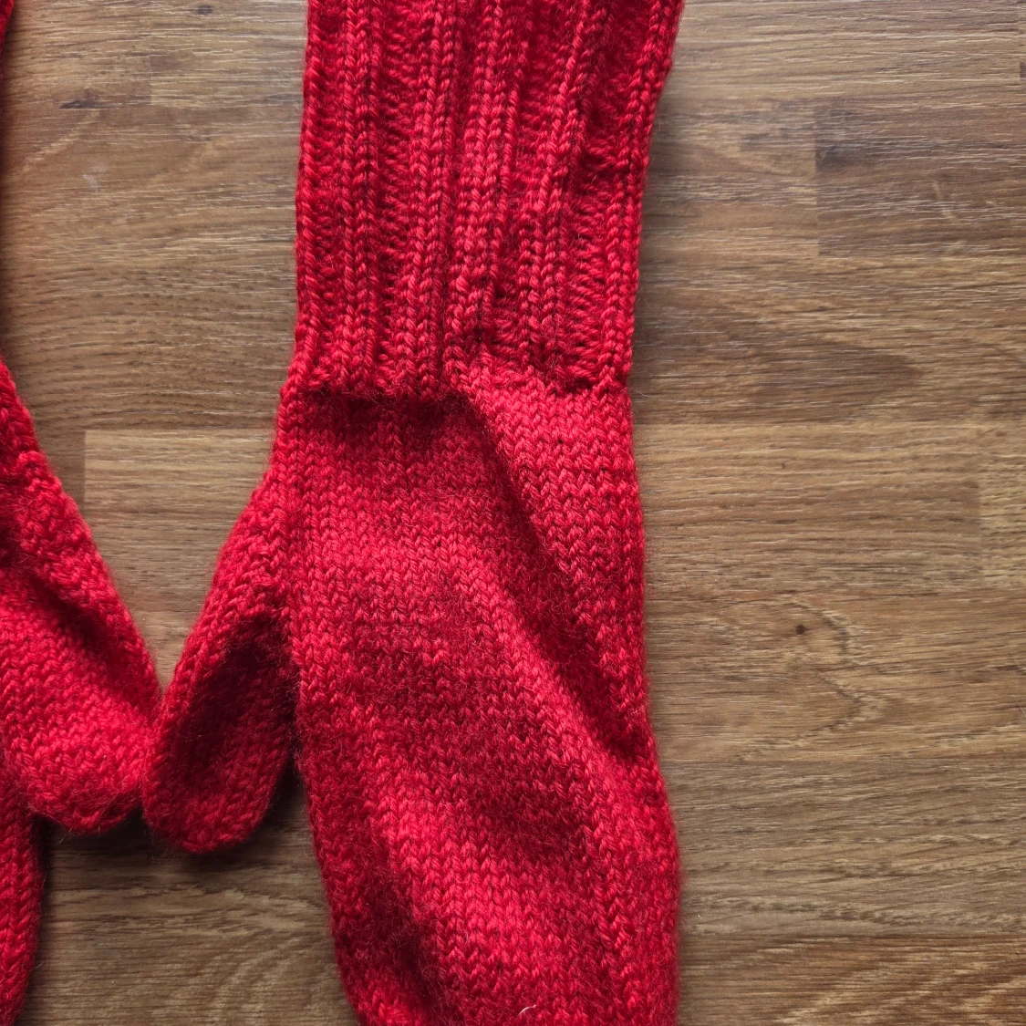 Säljer ett par röda stickade tumvantar med lång, ribbad mudd. Vantarna är i ett mjukt och varmt garn, perfekta för kalla dagar. Färgen är intensivt röd och designen är klassisk utan mönster eller detaljer. Grymma för dig som vill ha något enkelt och snyggt.