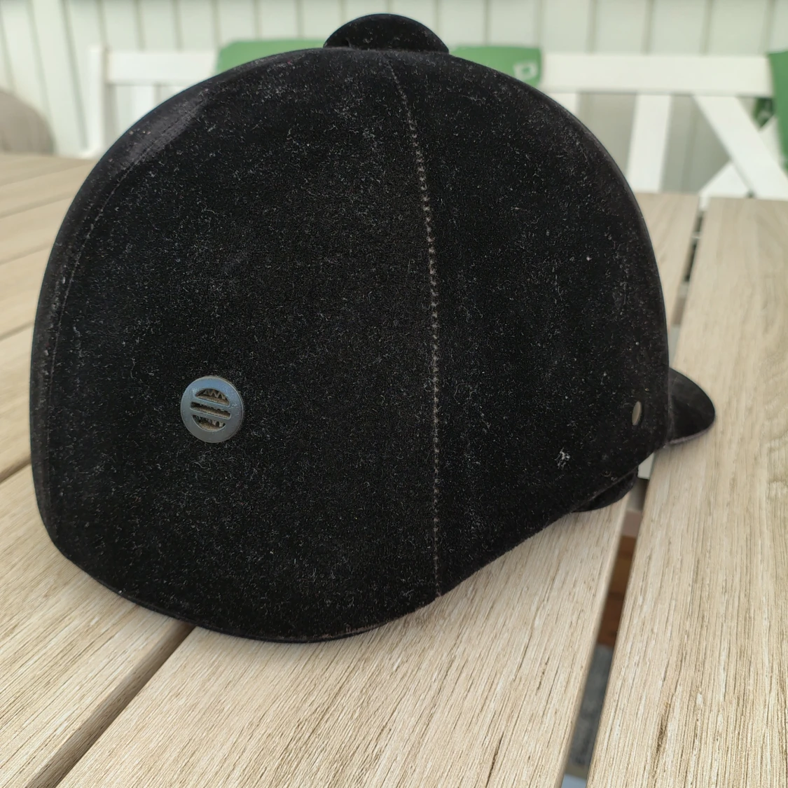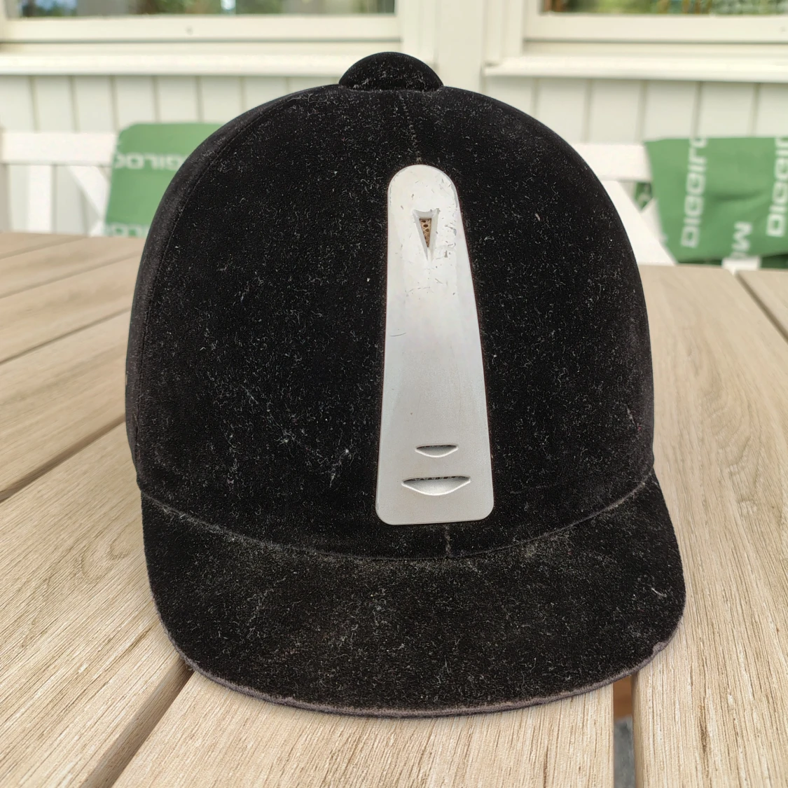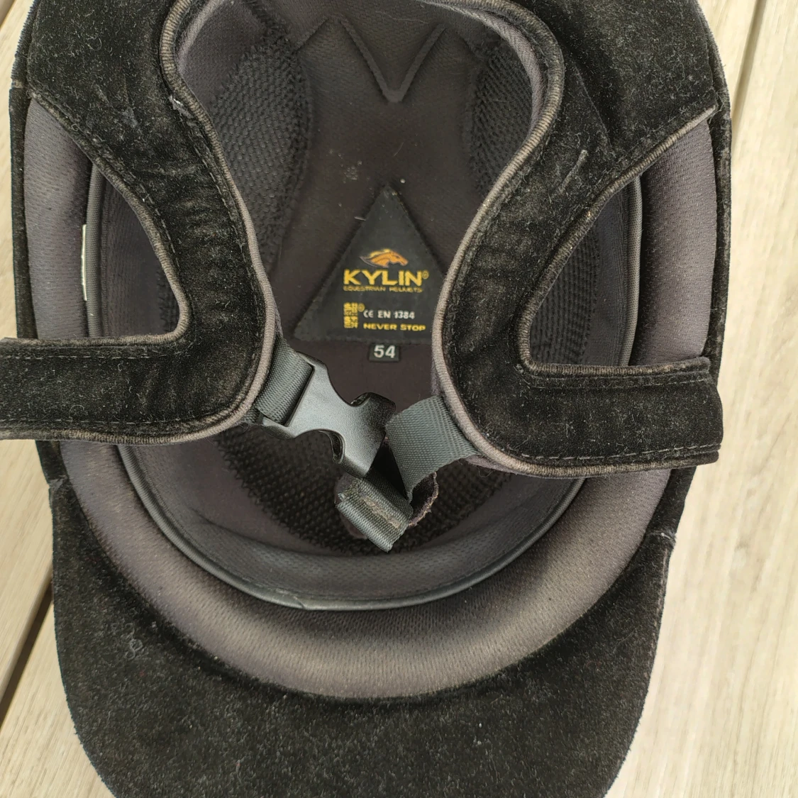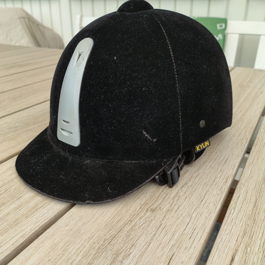 Snygg svart ridhjälm från Kylin med sammetsyta och silverfärgad detalj. Fint skick men använd, har aldrig trillat av med eller slått i på något sätt. Kan gå ner i pris vid snabb affär☺️