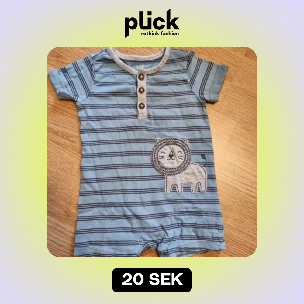 Randig playsuit/jumpsuit/onesie med ett lejon i storlek 6 mån (ca strl. 68) från Carter's. I fint begagnat skick, inga hål eller fläckar. Tvättad i parfymfritt tvättmedel och utan sköljmedel.