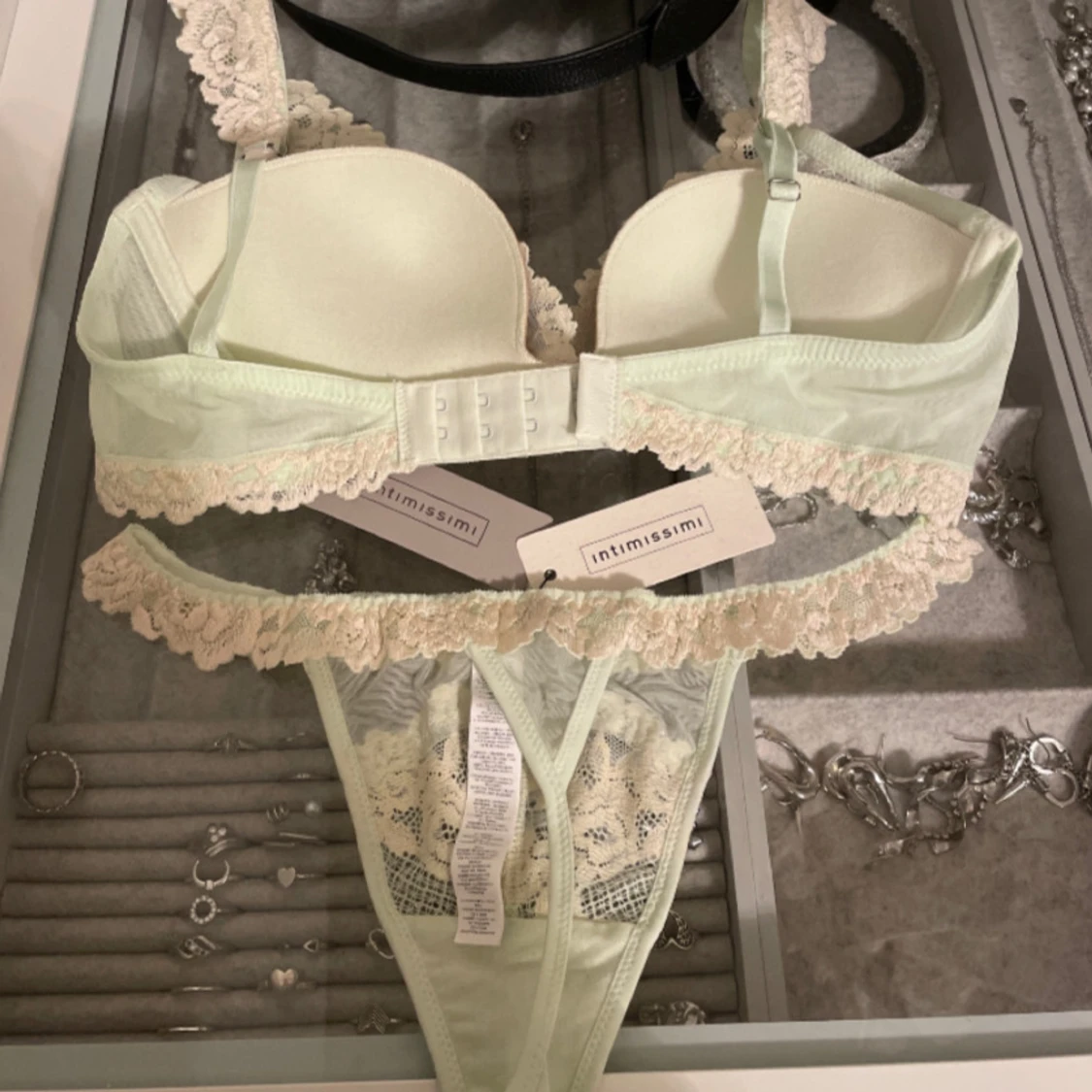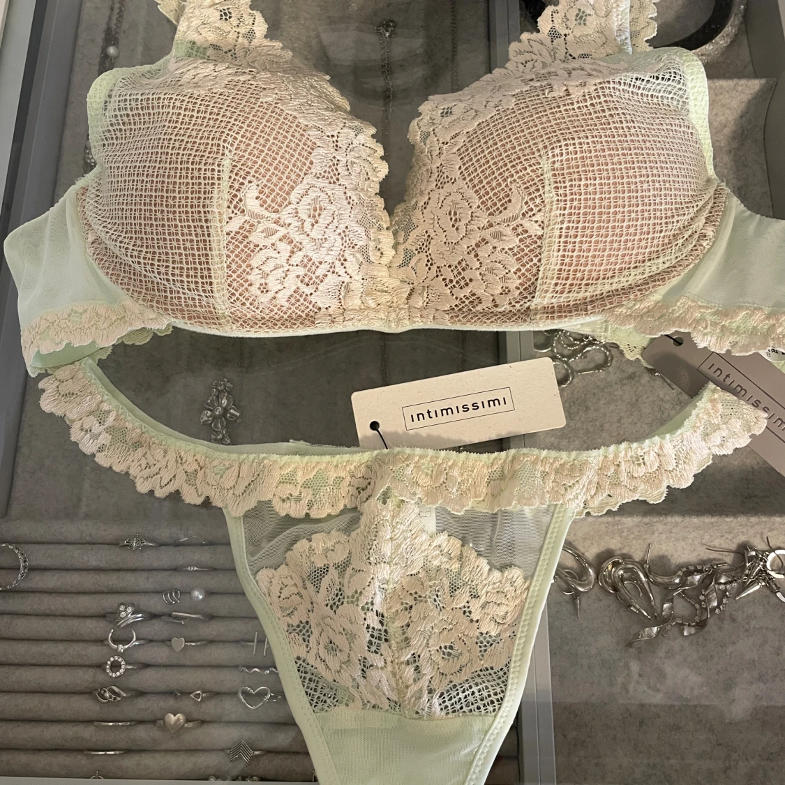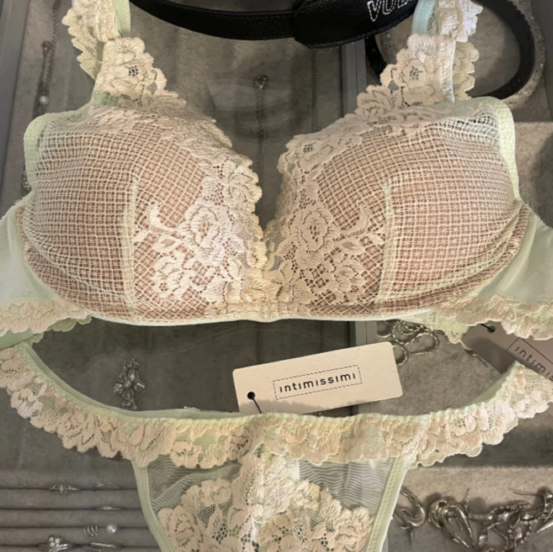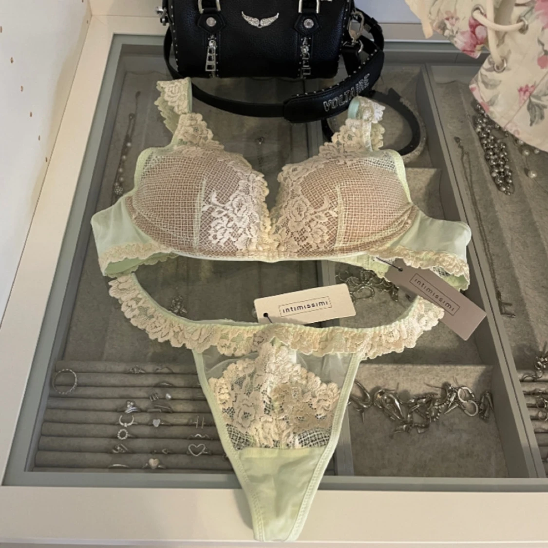 Helt nytt med prislapp, ljus mintgrönt set från Intimissimi med blommig spets. Bh storlek 70c, trosor i S. Finns inte att köpa längre! Säljer hela för 750kr, nypris över 900kr!