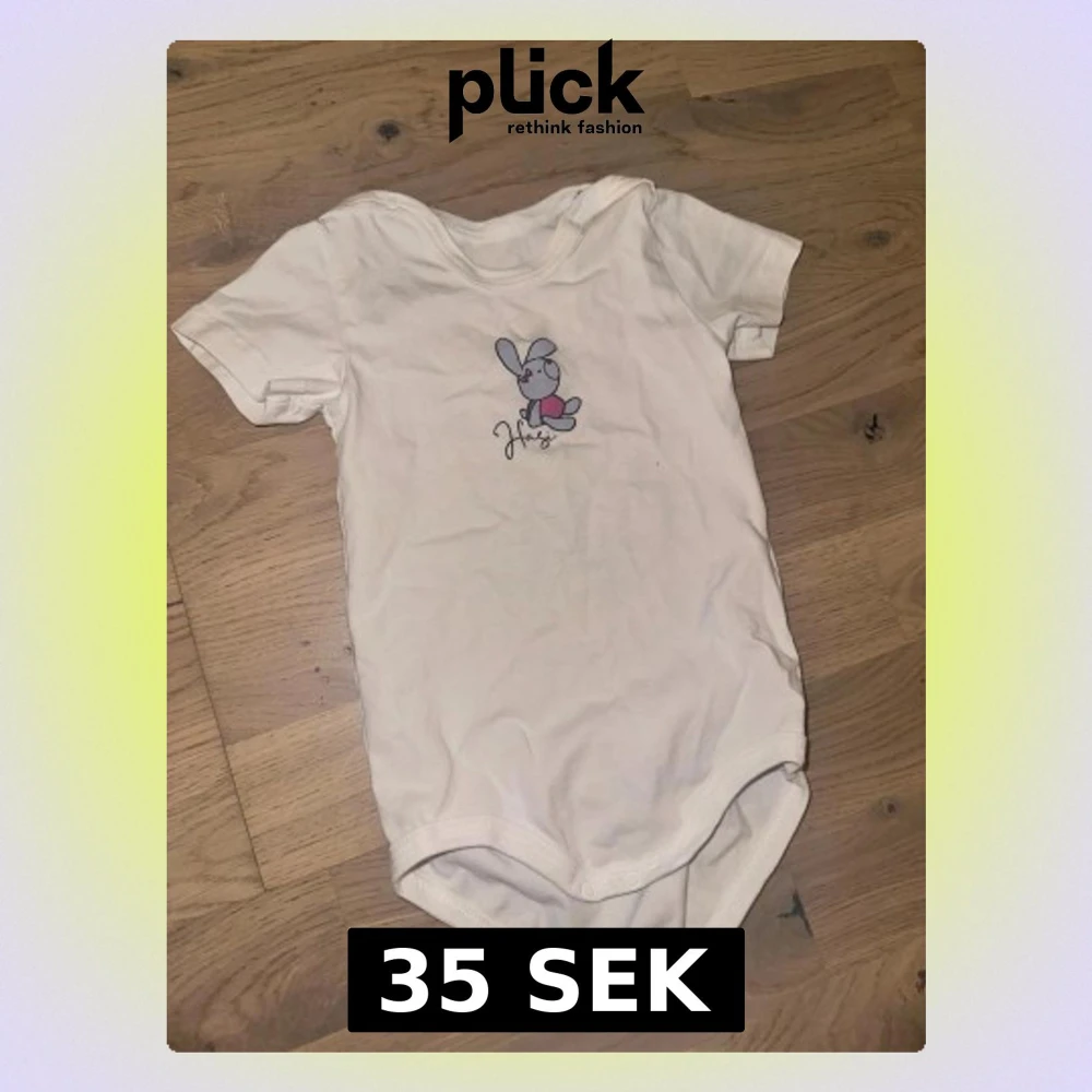 Söt vit body från Kanz i storlek 74/9M med korta ärmar och tryckknappar i grenen. Framtill finns ett gulligt tryck med en tecknad kanin och texten 'Hasi'. Perfekt för små barn som gillar mjuka och bekväma kläder.Vit body med korta ärmar och tryck av en kanin med ett hjärta.