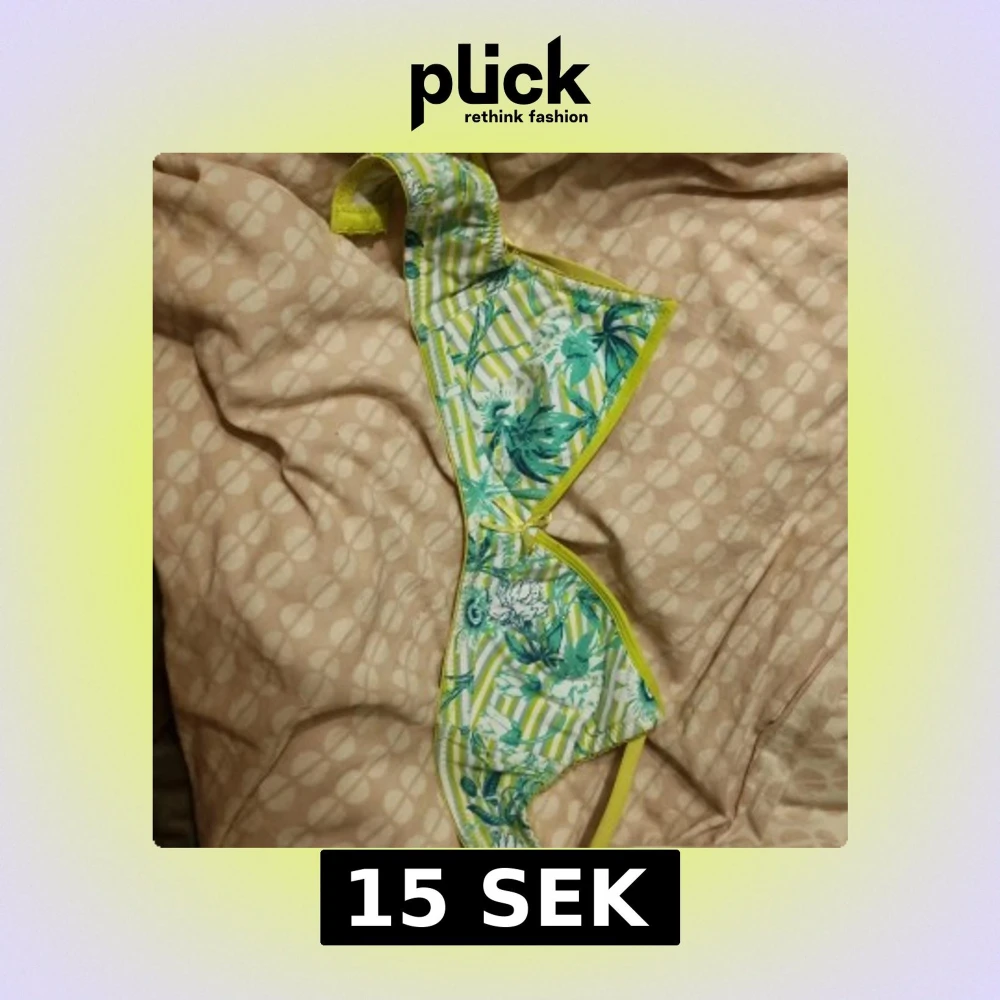 Snygg behå från Hema med ett tropiskt blommönster i grönt och blått mot en randig bakgrund. Den har gula kanter och justerbara axelband för perfekt passform. Perfekt för sommaren!
