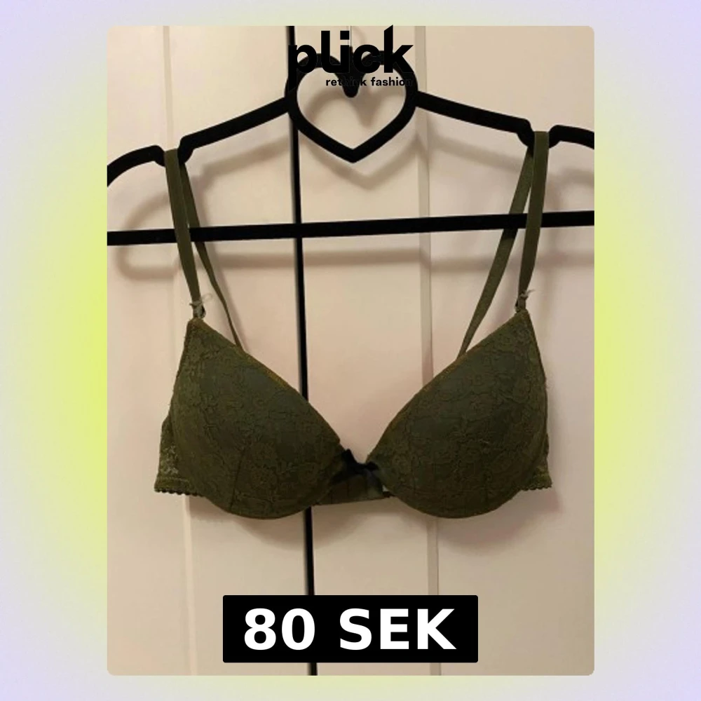 Säljer en olivgrön bh med spetsdetaljer från lindex i storlek 75B. Utsidan har ett blommigt spetsmönster och insidan är ljusrosa. Axelbanden är justerbara.💕