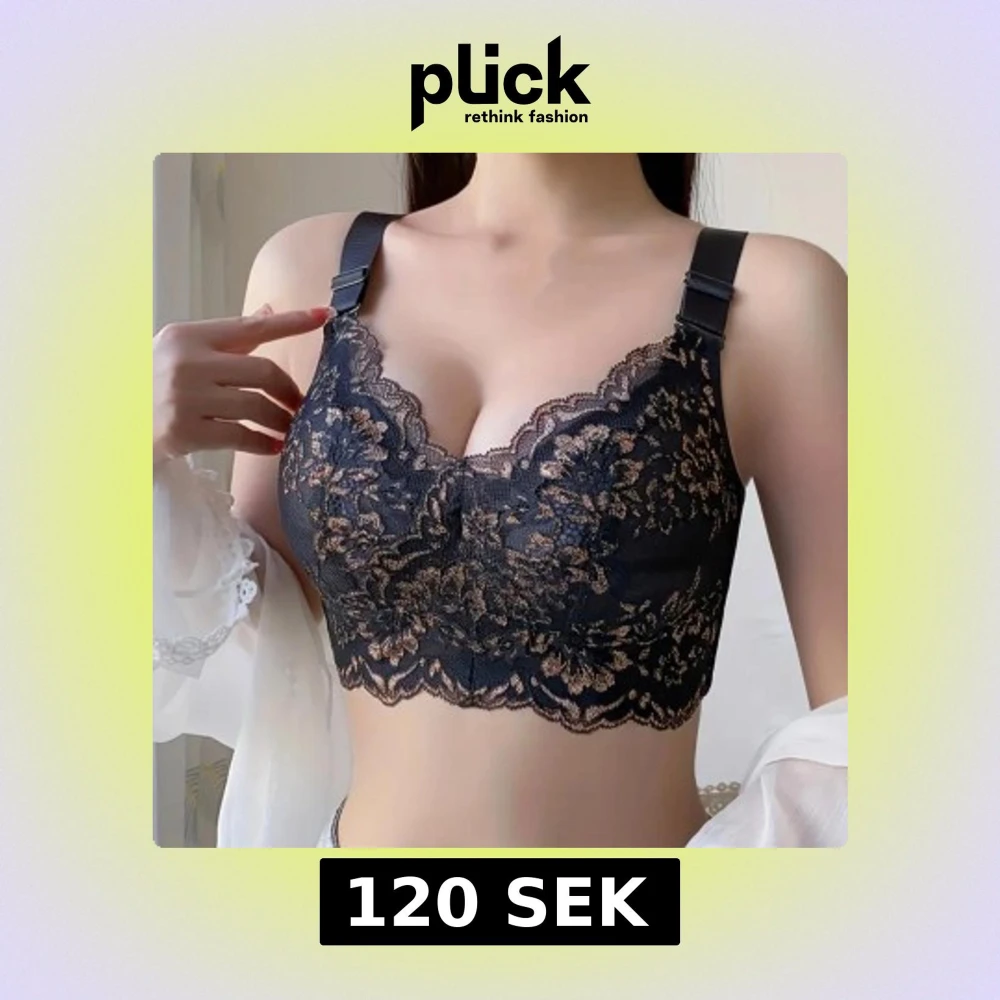 Säljer en svart BH med blommigt spetsmönster och breda axelband. Den var för liten, jag använder 80F. Aldrig använt.