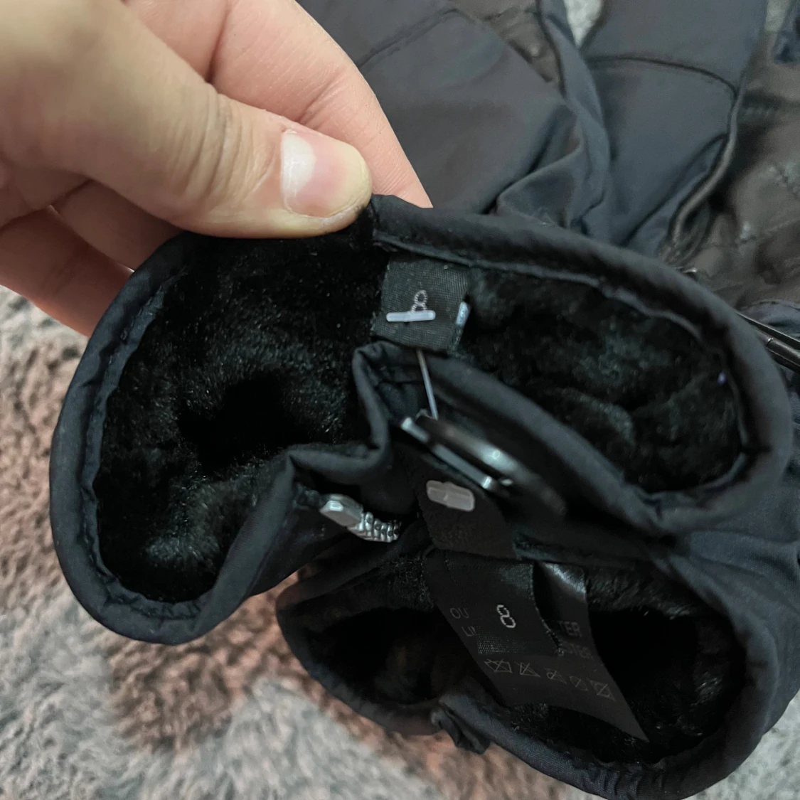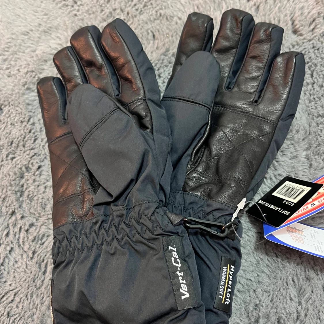 Svarta fodrade vinterhandskar från Vert.Cal med HyperLoft-isolering. Utsidan är i syntetmaterial med dragkedjedetalj och insidan har mjukt foder. Handflatan är förstärkt med svart skinn för extra grepp. Perfekta för kalla dagar när du vill hålla händerna varma.