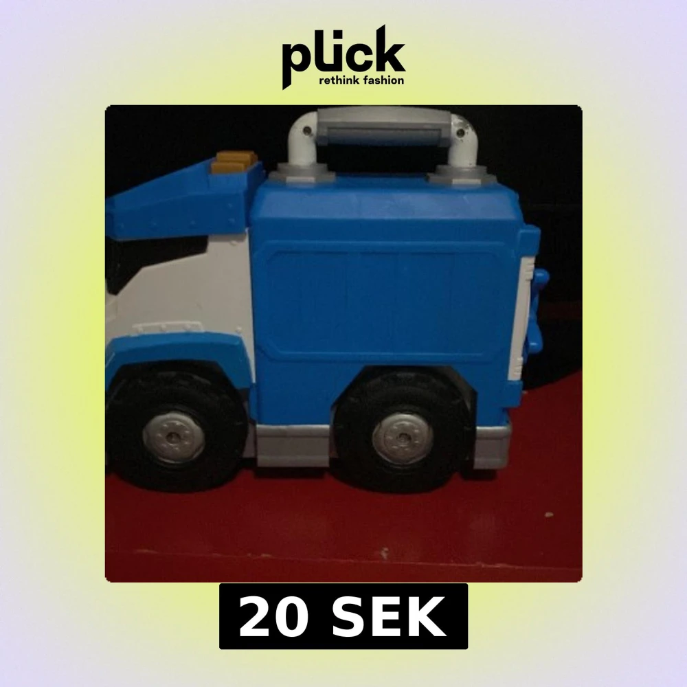 Bilderna visar en leksaksbil, troligen en lastbil eller bankbil, med texten 'Mr. BANK$' och 'REAL WORKIN' BUDDIES' på sidan. Den är blå och vit med stora hjul och ett handtag upptill. Ingen bok syns på bilderna.