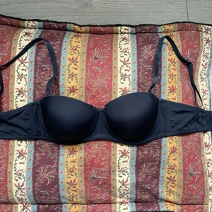 Svart balconette bh i multiway” från Kappahl. Kan användas strapless. Guldiga detaljer och reglerbara axelband. Axelbanden kan bäras på olika sätt tex. korsade i ryggen. Silikonkanter upptill och nedtill som får bhn sitta extra bra. Storlek 80B