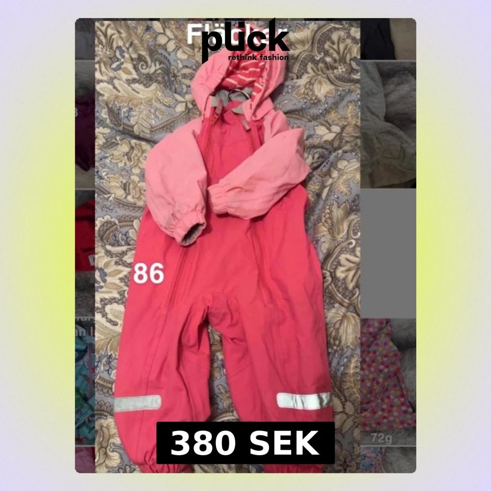 Säljer en rosa skaloverall med ljusrosa ärmar och huva med rosa- och vitrandigt foder. Overallen har två dragkedjor framtill och reflexdetaljer på benen. Perfekt för kyliga dagar och lek utomhus.🌸 Fläckar. Storlek 86
