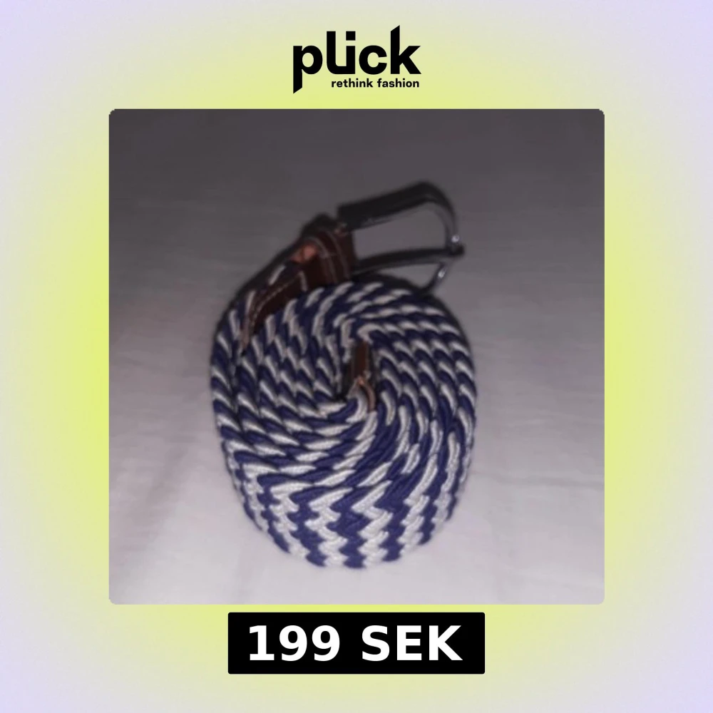 Snyggt bälte med blåvitt sicksackmönster och detaljer i brunt skinn vid spännet.