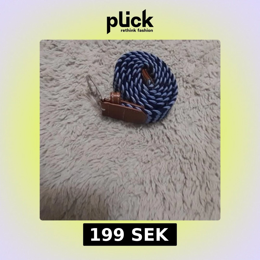Säljer ett snyggt randigt bälte i blått och vitt med bruna skinn-detaljer och silverfärgat spänne. Bältet har en flätad design som ger en cool och modern look. Perfekt accessoar för att lyfta din outfit.